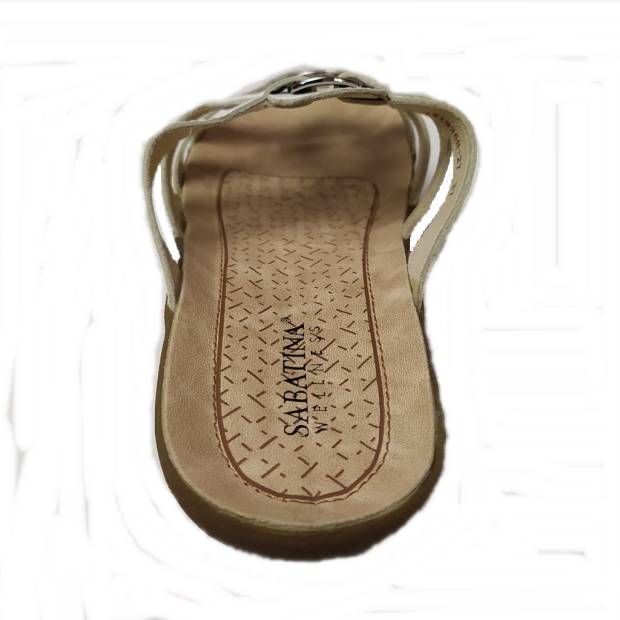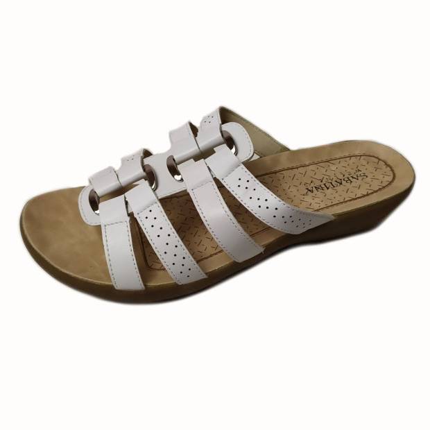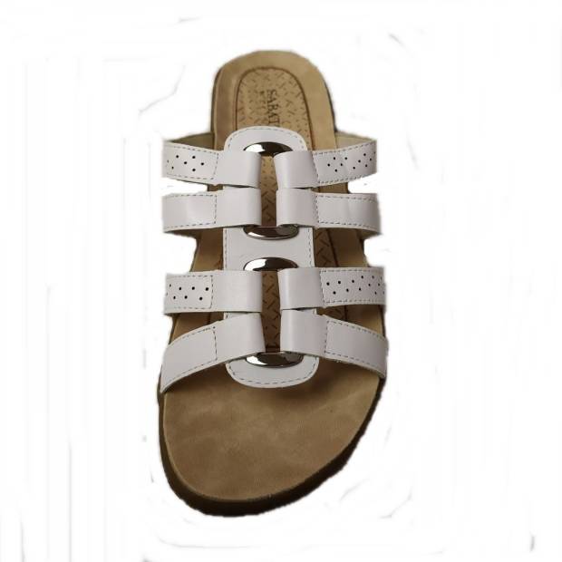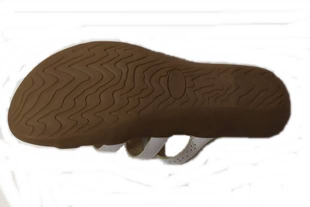 Fehér színű, pántokkal díszített lapos talpú női papucs. Fémes színű geometrikus rátét és lézervágott minta teszi különlegessé a klasszikus fehér eleganciát.