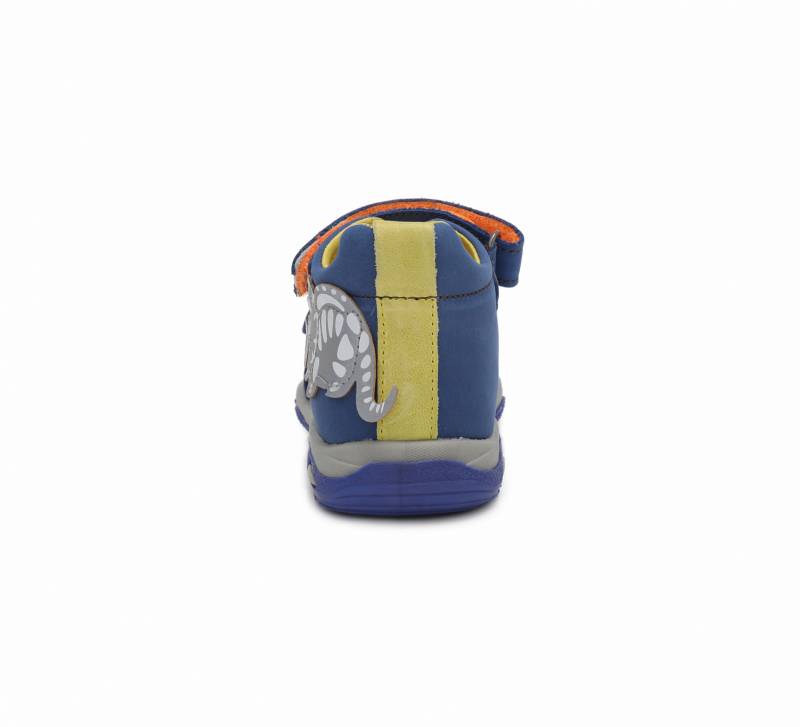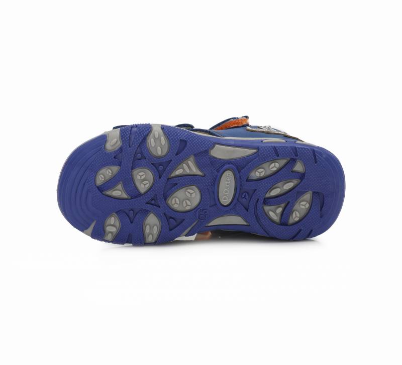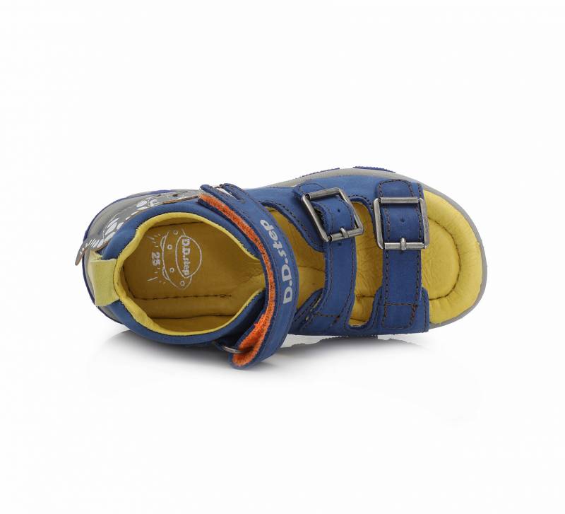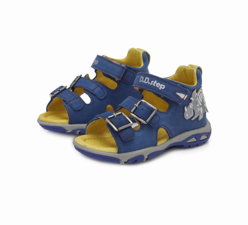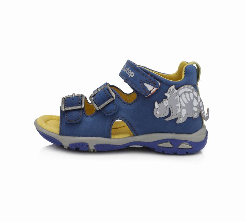 Nyitott orrú és zárt kérgű (sarokrészen zárt) gyerek szandál, mely stabil tartást biztosít a boka számára. A szandál kék színű oldalán egy dínó figura van.Valódi bőrből készült a külső és a belső része is, talpa pedig természetes gumiból, ami strapabíró és jól tapad.