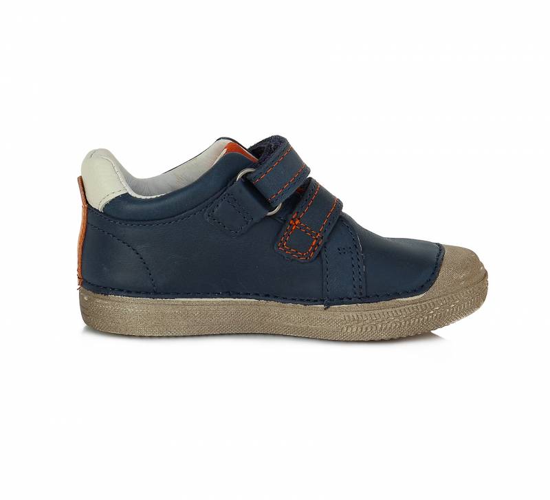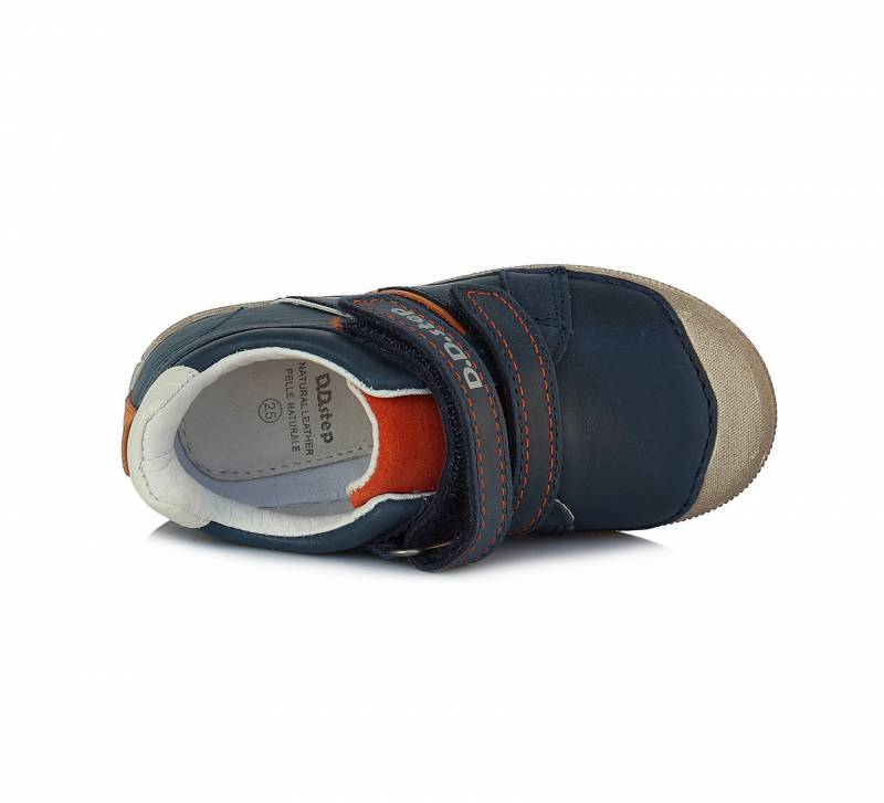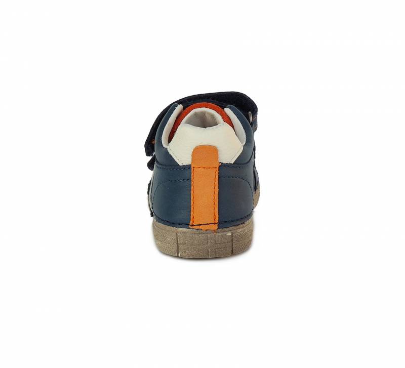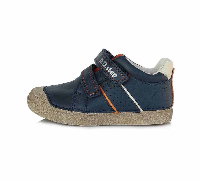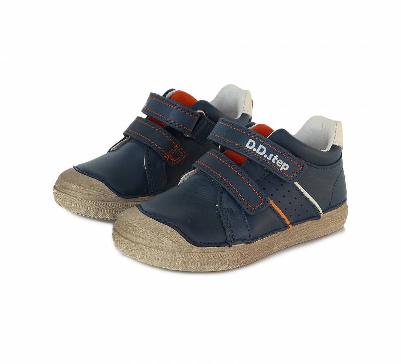 Sötétkék és narancsságra színű DD Step kényelmi fiú cipő. Elején két darab tépőzárral használható. A cipő orra erősített, talpa pedig természetes gumiból van. Megbízható és minőségi magyar márka.