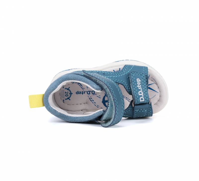 Fiú szandál játékos gyerekek számára, zárt sarokrésszel, nyitott orral. A nyitott orr lehetővé teszi azt, hogy kicsit tovább hordhassa a gyerek mielőtt kinövi. Világoskék színű, valódi bőrből készült, talpa pedig természetes gumiból.