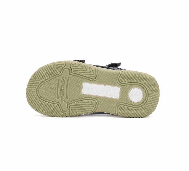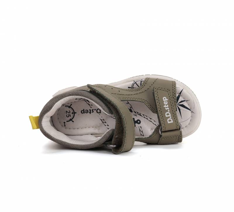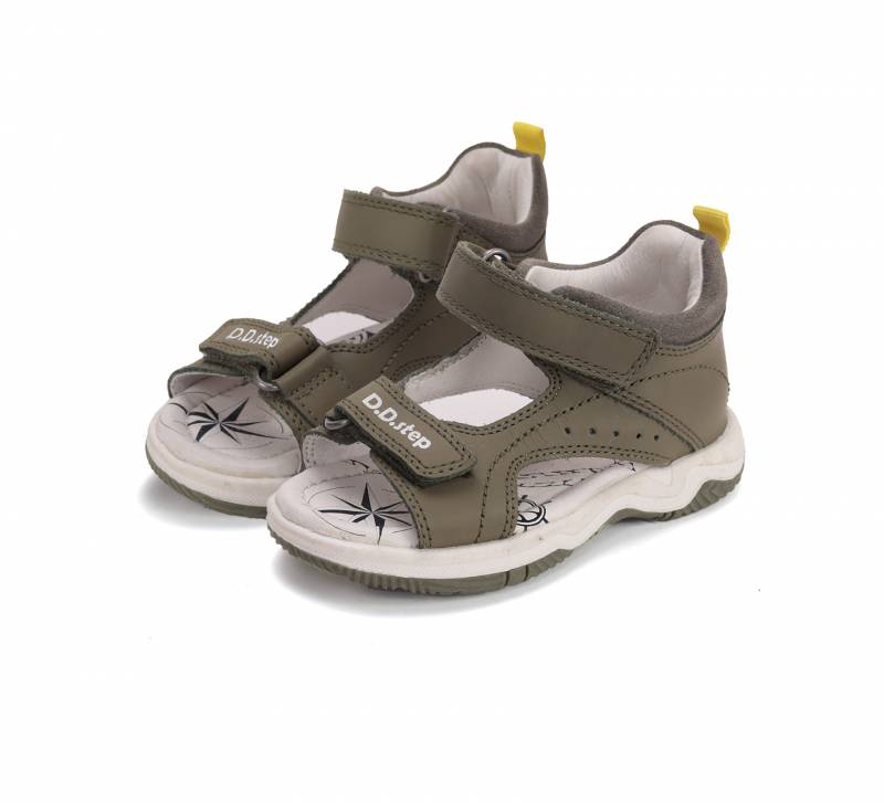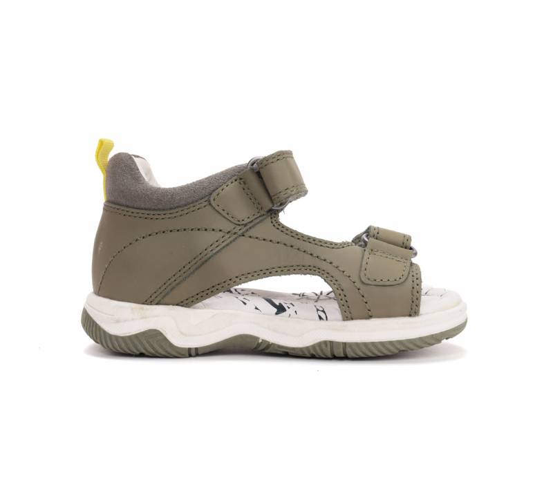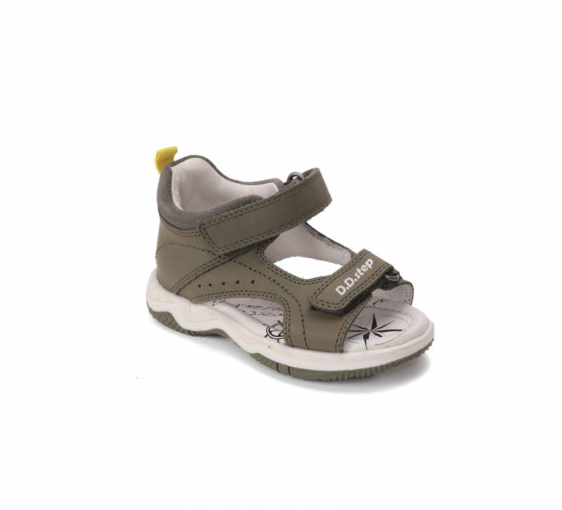 Olívazöld Fiú gyerekszandál, zárt sarokrésszel, nyitott orral. A nyitott orr engedi, hogy kicsit tovább nöjjön a gyerek lába, mint a zártorrú szandáloknál. Valódi bőrből készült, kívül-belül, talpa pedig természetes gumiból, ami jól tapad.