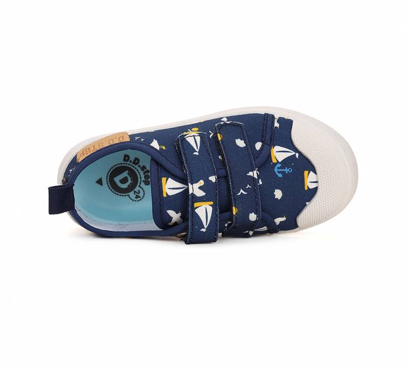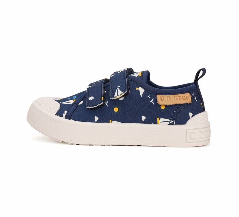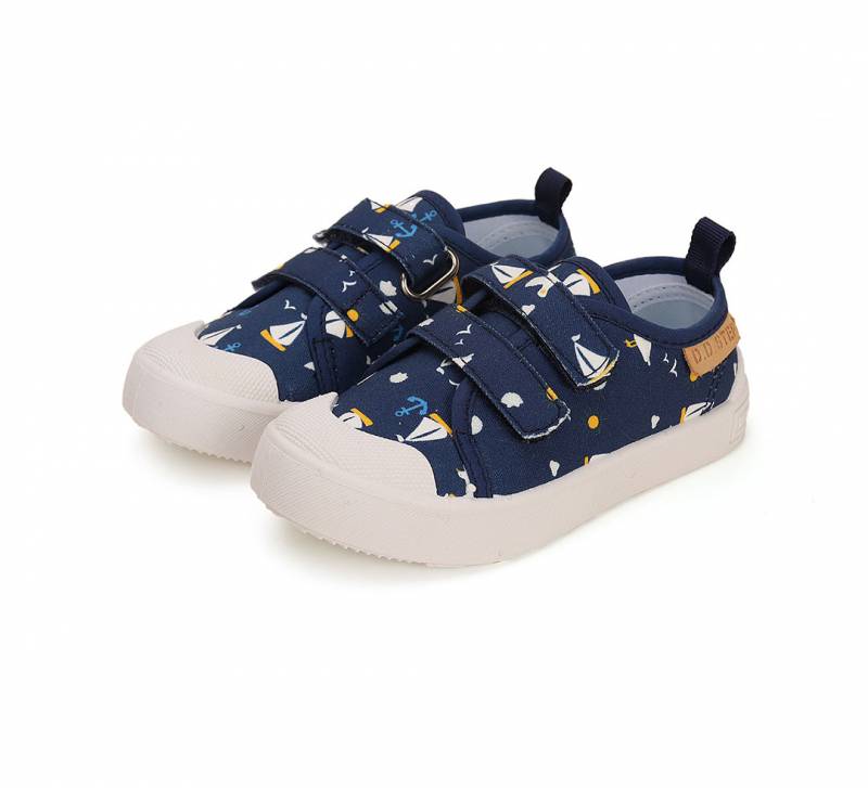 Fiú vászoncipő a DD Steptől, sötétkék színben hajós mintákkal. Két tépőzárral működik, az orra erősített, valamint mosógépben is moshato 30°C alatt, a talpbetétet ajánlott kivenni ilyenkor, és mosózsákot is érdemes használni.