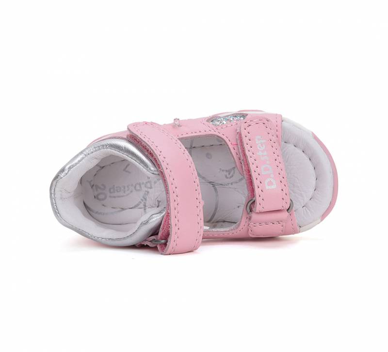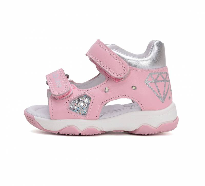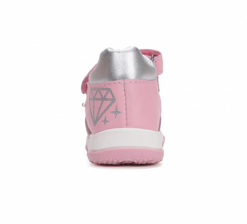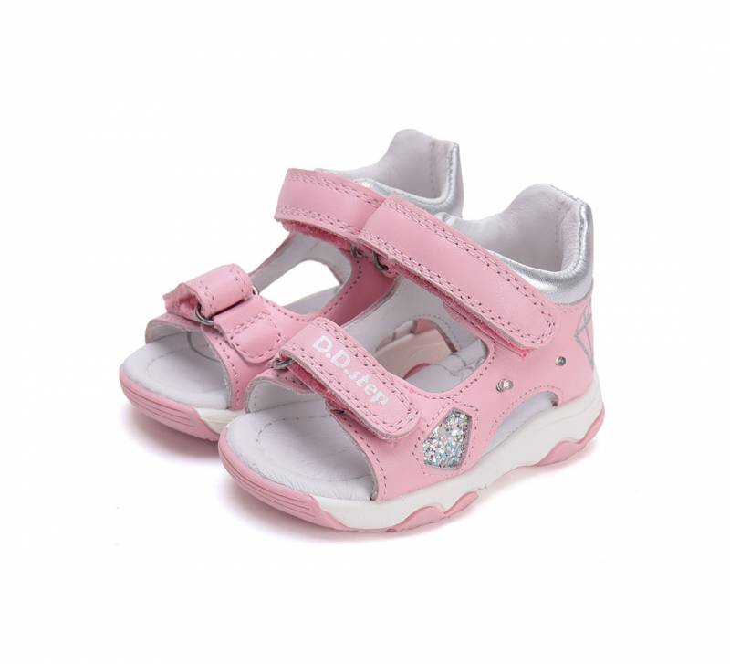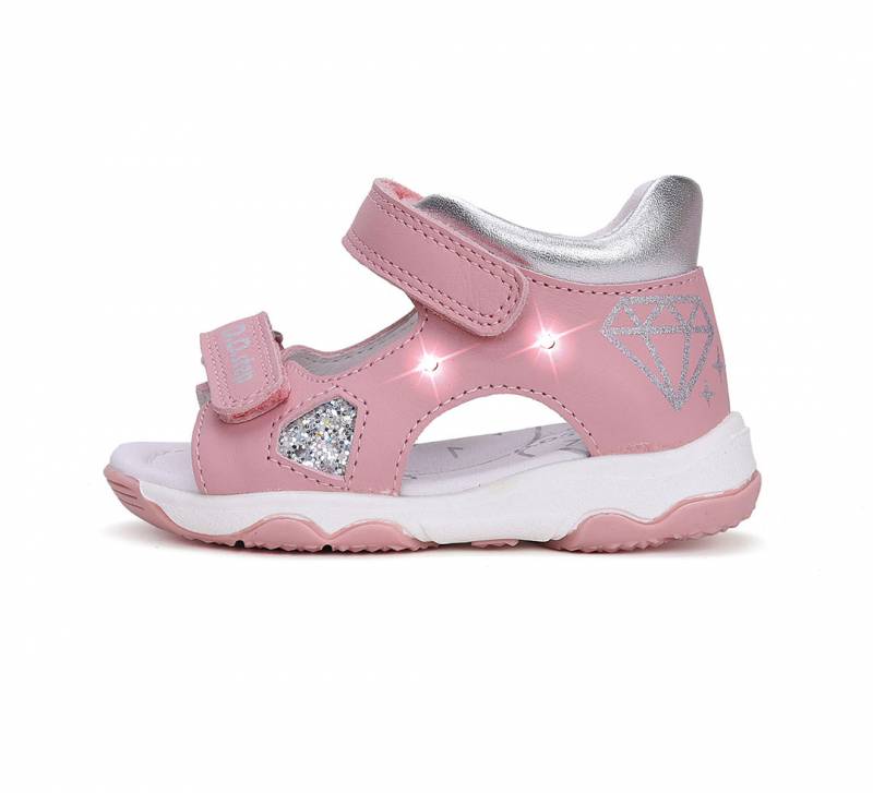 LED fényekkel ellátott DD Step gyerekszandál, gyémántos mintával díszítve. Minőségi anyagokból készülnek ezek a lábbelik, kívül-belül bőr. Természetes gumitalppal rendelkeznek, így nehezen kopik, jól tapad és jól hajlik. A LED fényhez való áramforrást cserélni nem lehet, az élettartamát jelentősen befolyásolja a környezete.