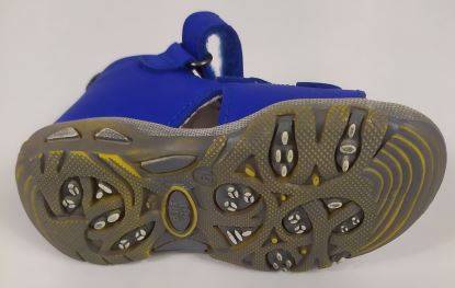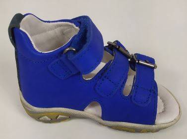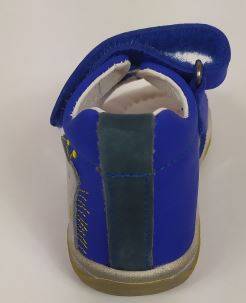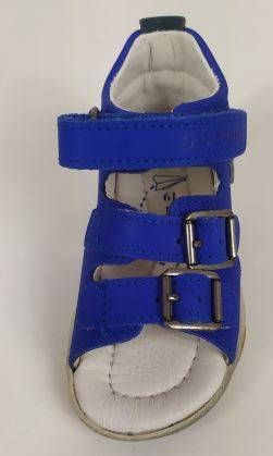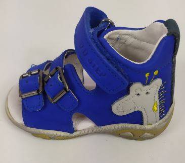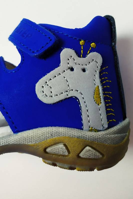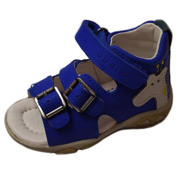 Nyitott orrú és zárt sarokrésszel rendelkező kék fiú szandál a DD Step-től. Oldalán egy fehér zsiráf van. Valódi bőr felső és belső résszel rendelkezik a cipő, valamit természetes gumitalppal, ami jól tapad és strapabíró.