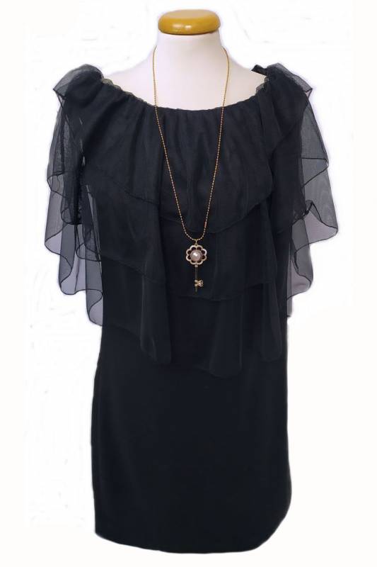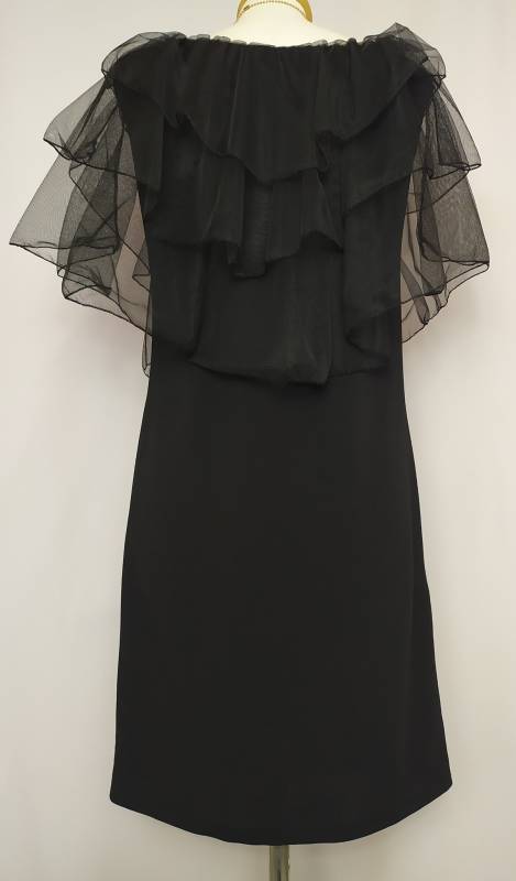 Tekete színű női alkalmi ruha. Fazonja követi a test vonalát, kiemeli az alakot. Mellrésze különleges tüll fodrok teszik különlegessé. Modern, divatos darab, minden korosztály számára ajánljuk.