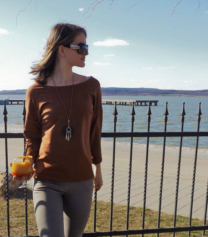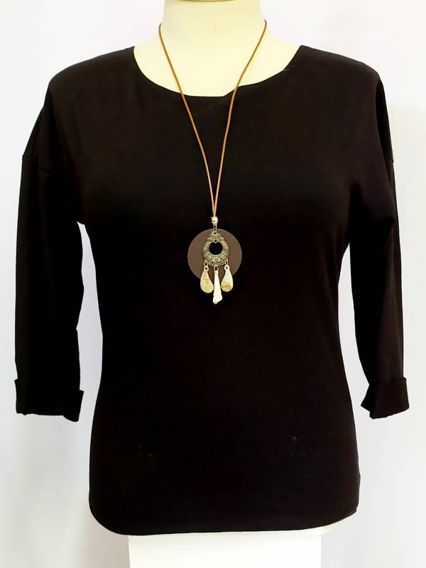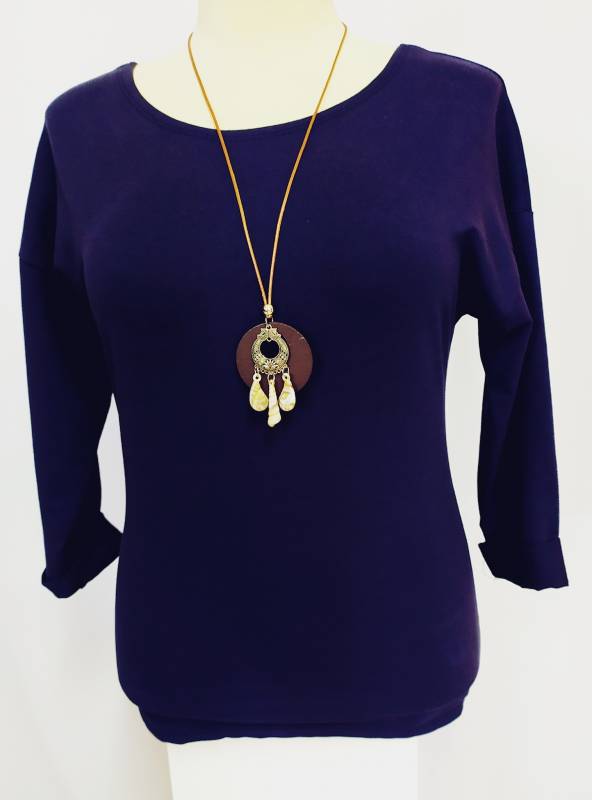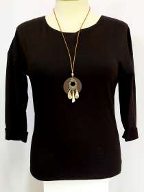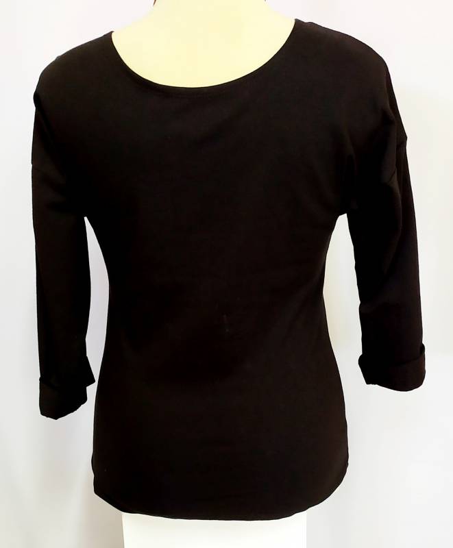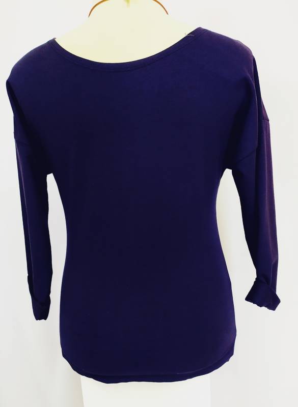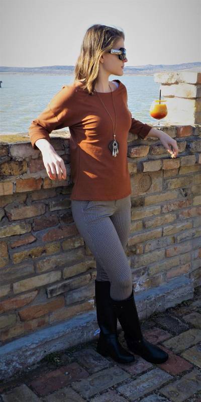 Női felső kerek nyakkivágással egy méretes kivitelben. Hosszú ujjú fazon, melyet felhajtva és leengedve egyaránt viselhetünk. A nyaklánc nem tartozéka a ruhának.
