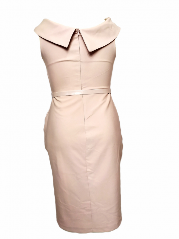 Sztreccses anyagú puder színű alkalmi ruha.
