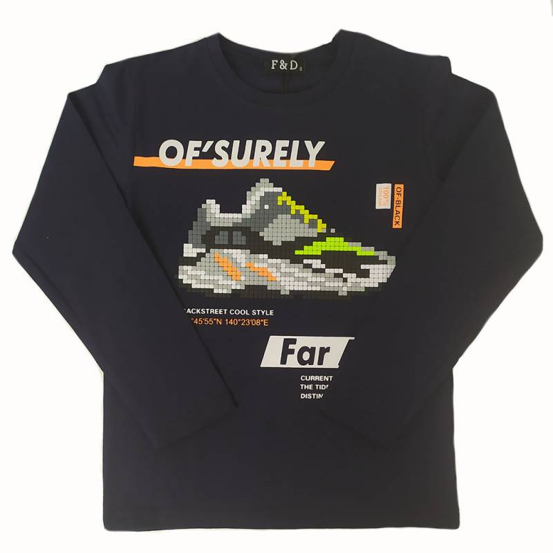 Hosszú ujjas fiú póló, divatos sneaker mintával. Neon színeivel minden kisfiú igazán vagánynak érezheti magát.