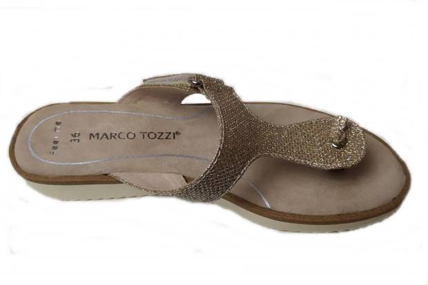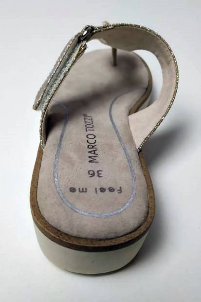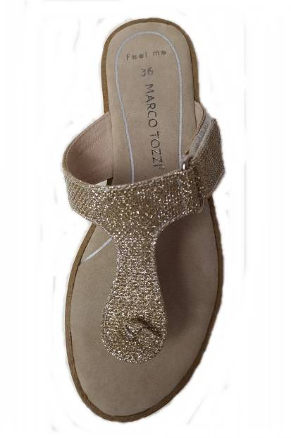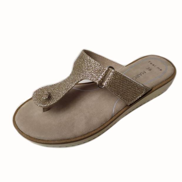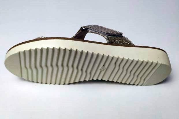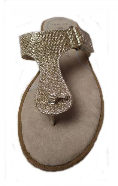 Könnyed tavaszi-nyári viselet. Fazonja kényelmes, nadrághoz, szoknyához egyaránt viselhető. Divatos pezsgő színe mindenhez passzol. Strukturált mintáján szolidan megcsillan a fény. Pántja tépőzáras, így könnyedén igazíthatjuk a lábfejhez. Puha talpbélése kíméli a lábat. Fiataloknak és idősebbeknek is bátran ajánljuk.