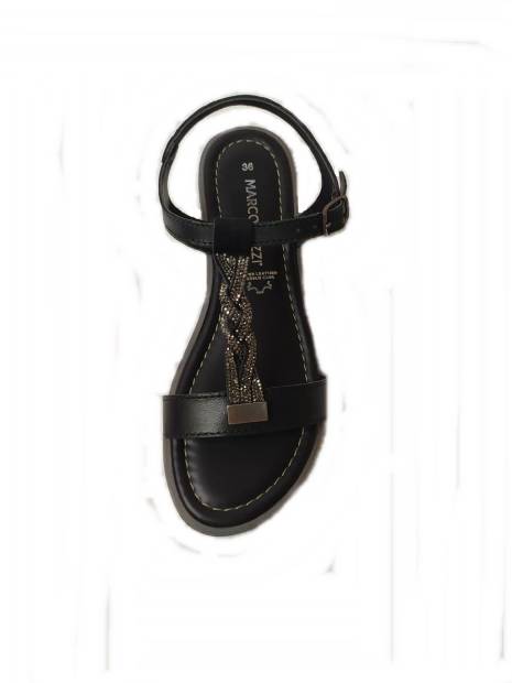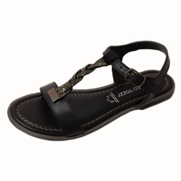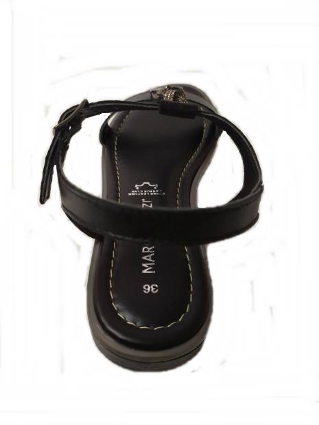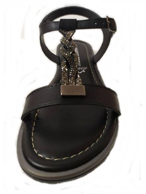 Könnyed tavaszi-nyári bőr szandál. Fazonja kényelmes, nadrághoz, szoknyához egyaránt viselhető. Divatos kövecskék diszítik. Sarka nem magas, ezért fiataloknak és idősebbeknek is bátran ajánljuk. Pántja csattal állítható. Puha talpbélése kíméli a lábat.