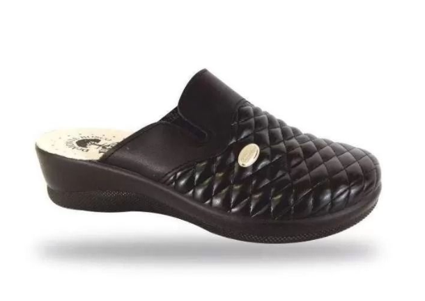 Női klumpa gyógypapucs, fekete színben. Talpbetétje bőrből készült, sarka kissé emelt. Orr része zárt.