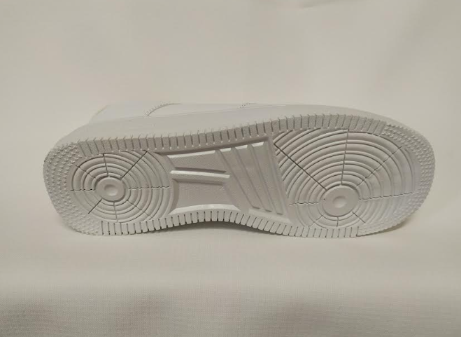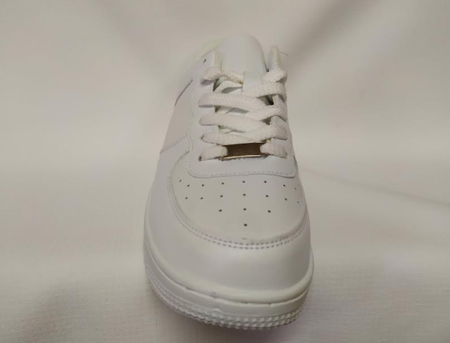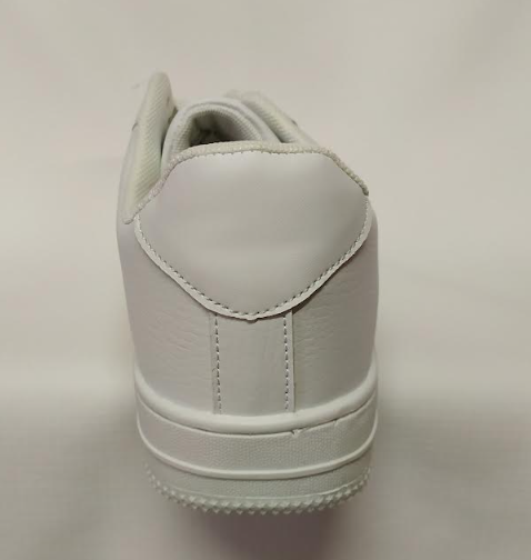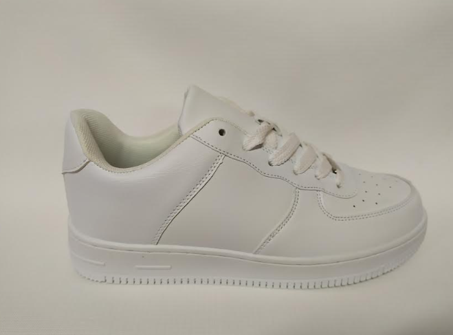 Fehér színű sportos cipő, enyhén magasitott a talpa.A cipőfűzőn egy fém dísz található.