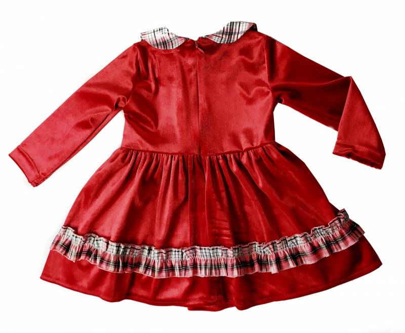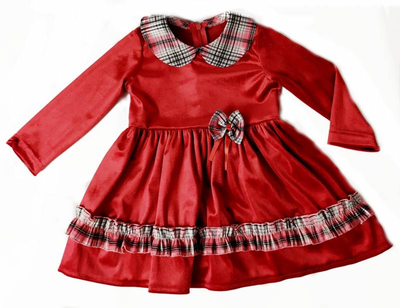 Aranyos, lányka alkalmi ruha. Az egyszínű piros ruhát, csinos kockás gallér, derékon masni diszíti. A szoknya részén is végig fut a kockás toldat.