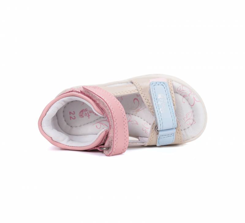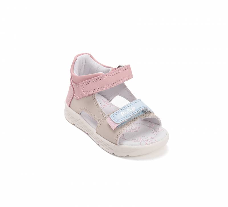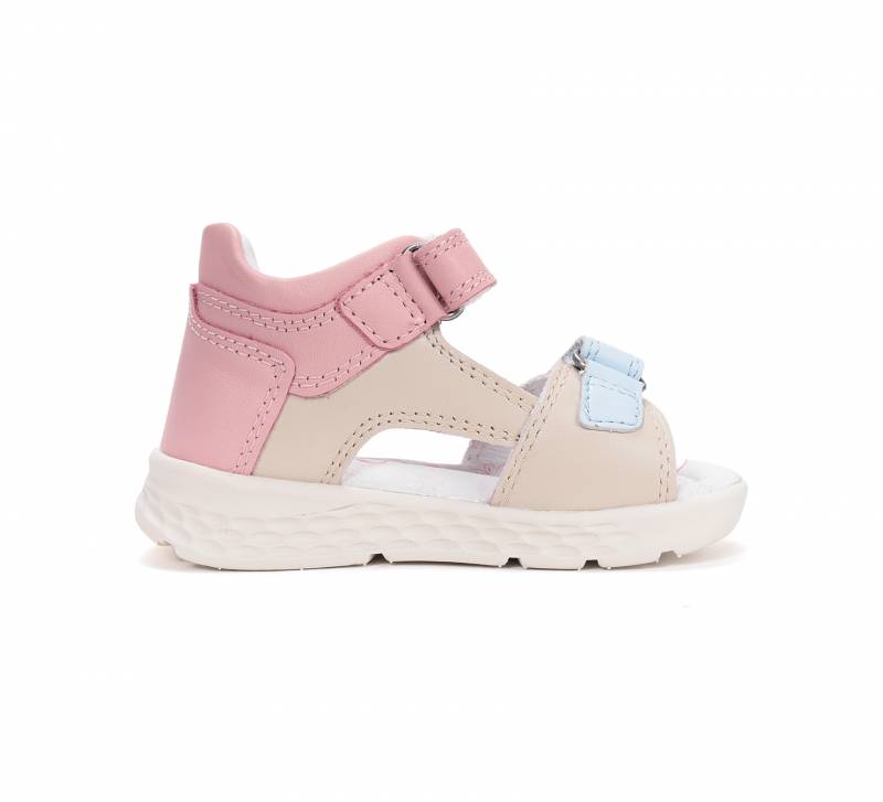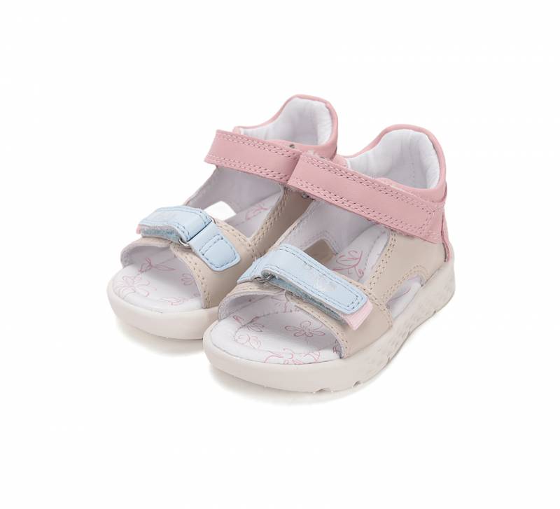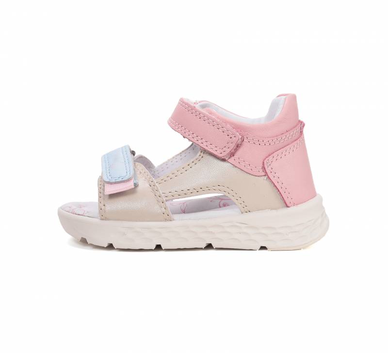 Szupinált talpú lány szandál, az egészséges lábfejlődés érdekében. Segít megelőzni az X láb kialakulását, mivel kiegyenesíti a gyerek lábát a speciális talpának köszönhetően. Krém, rózsaszín és világoskék színű. Valódi bőrből készült a talpbetétje és a külseje is.