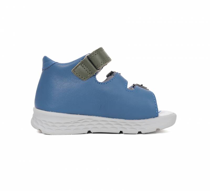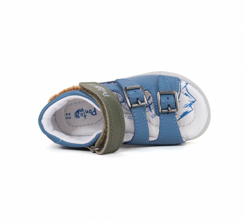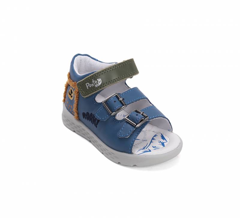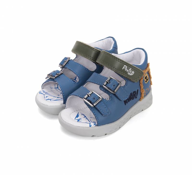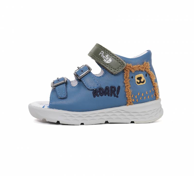 Medve figurás kis szandál olyan fiúknak, akiknek befele dől a lábuk. A szandál szupinált talpa egyenesbe hozza a lábakat, így megelőzi annak rosszul fejlődését. Két csattal, valamint egy tépőzárral állítható. A sarkán jól tart a cipő kérge, enyhén magas is.