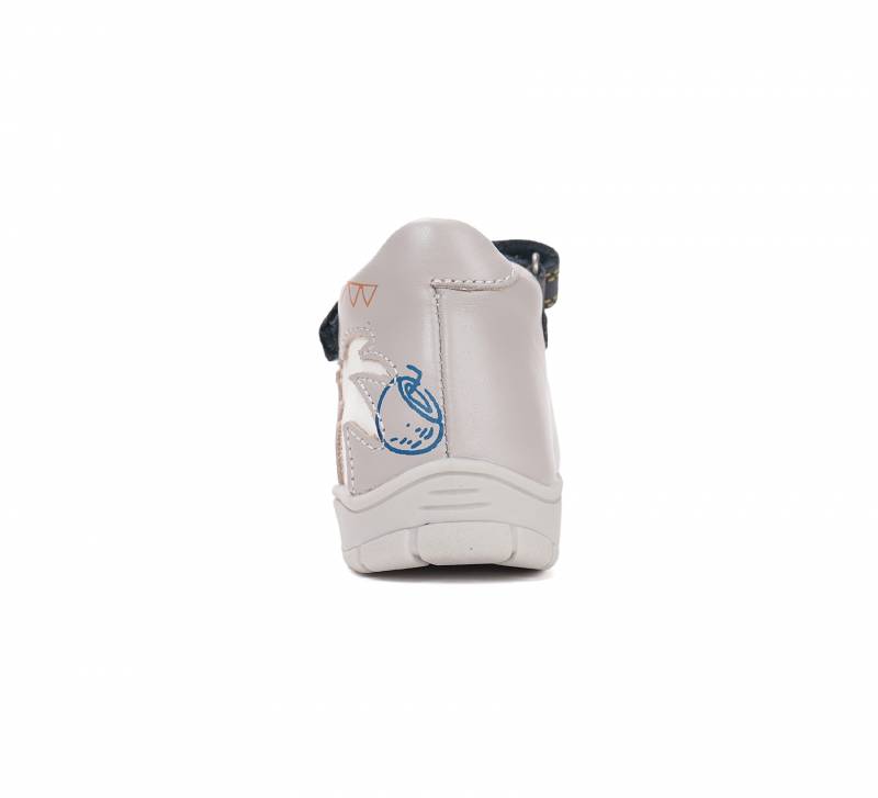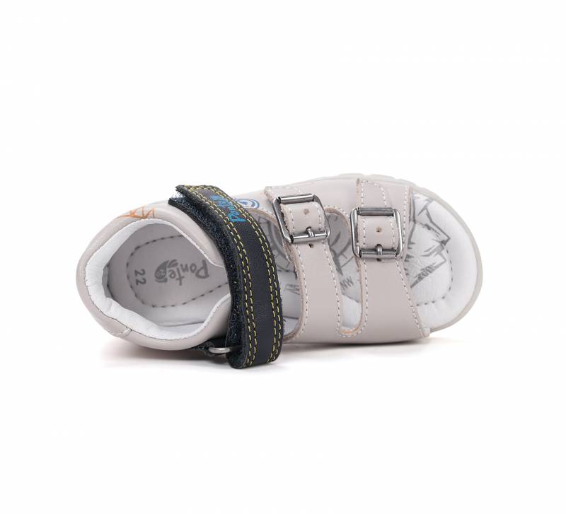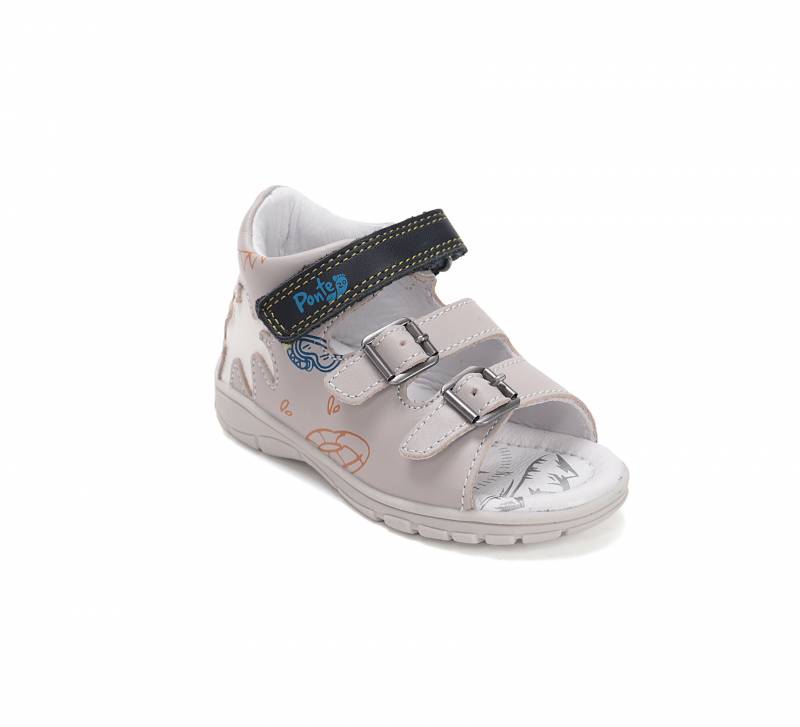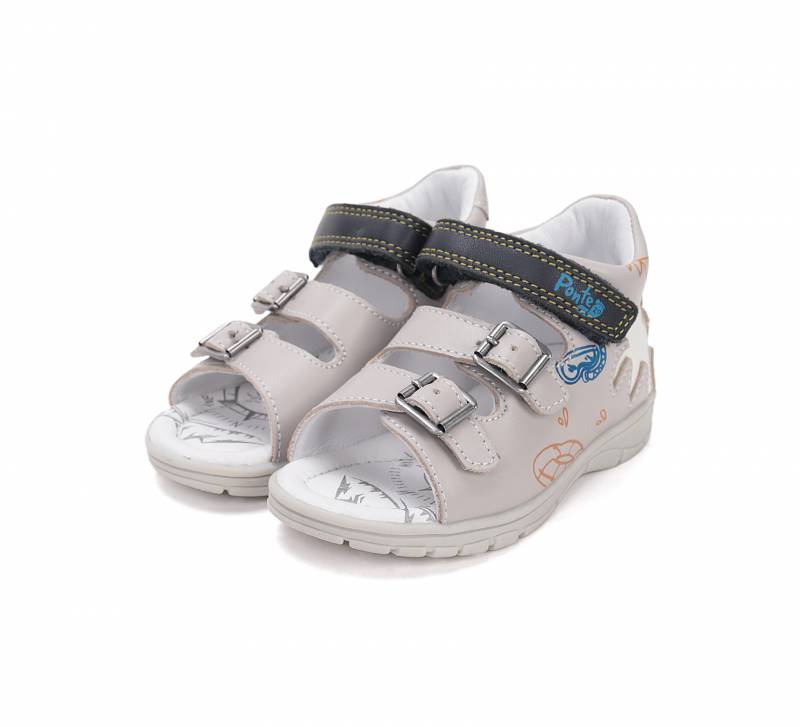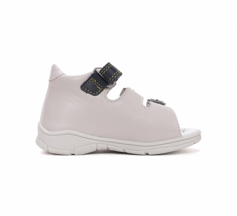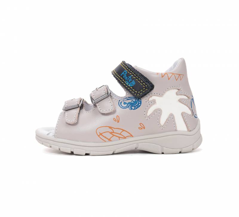Nyaralásra készen áll ez a kis szandál, pálmafával, úszógumival, kókusszal és egyéb strand kellékekkel az oldalán. Szürke színű, Tépőzárral és kettő darab csattal állítható. Bőr kívülről, és belülről is, talpa pedig természetes kaucsuk gumiból készült. Magas a szára, így jobban tartja a gyerek bokáját is. Szupinált talpa pedig kiegyenesíti a befele dőlő bokákat, így egészséges fejlődést biztosít a lábak számára.