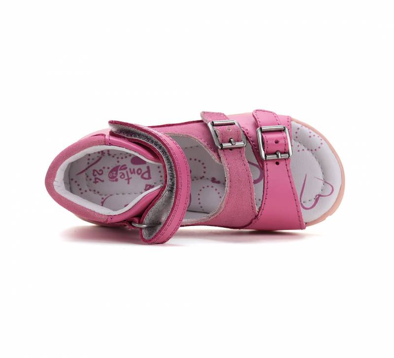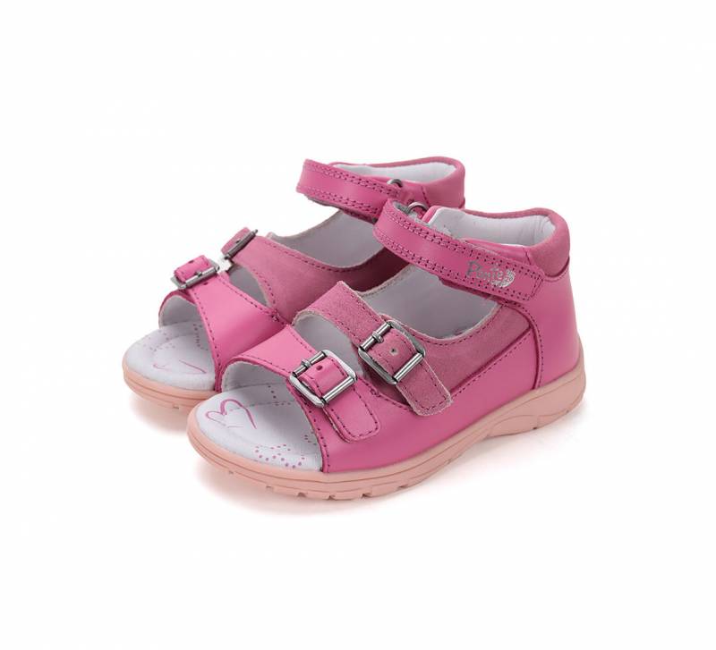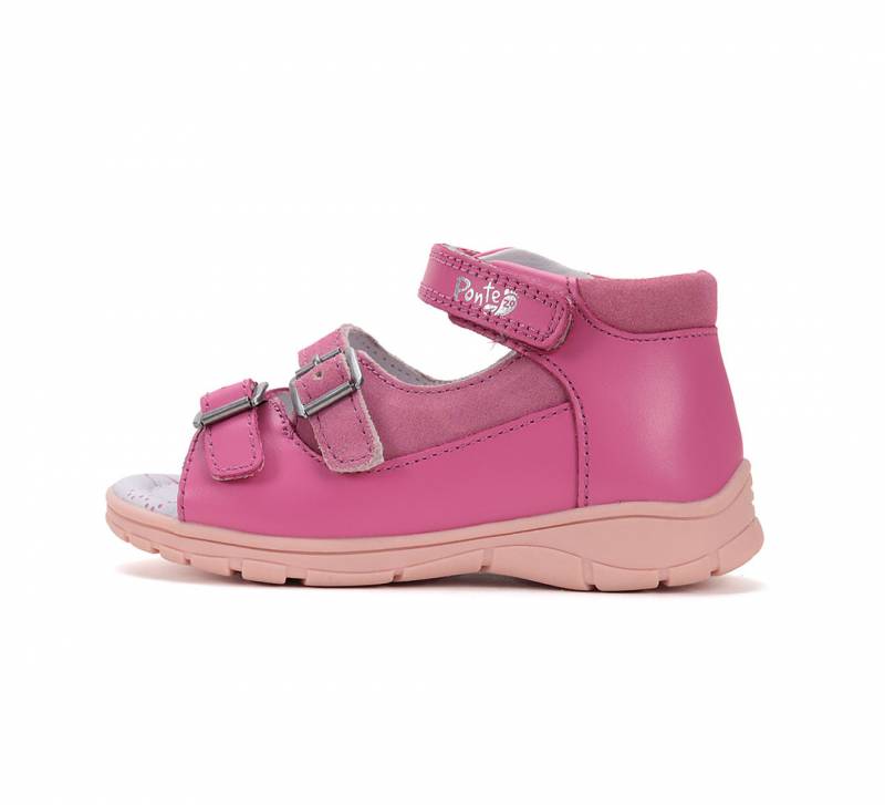 Rózsaszín színű szupinált gyerek szandál a DD Steptől, Ponte 20 név alatt. Kívül belül bőrből készült, talpa jól tapadó és strapabíró gumiból van. Elősegíti a befele dőlő lábak egészséges fejlődését.