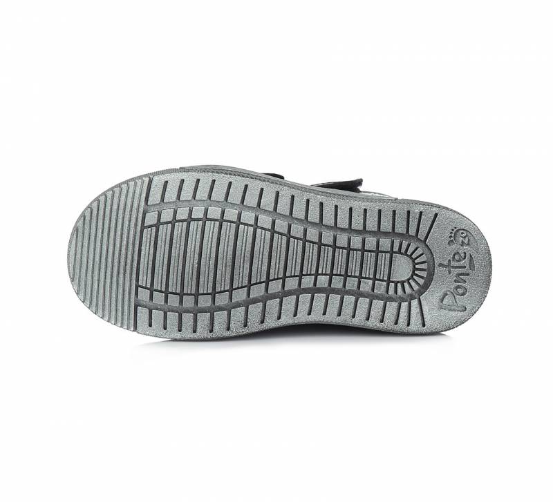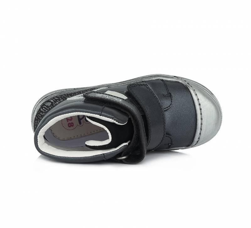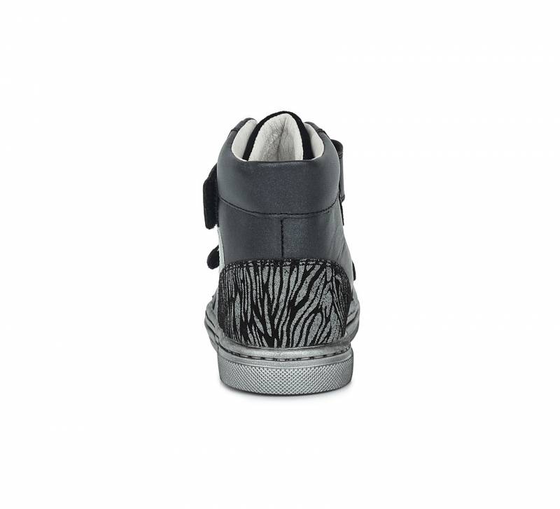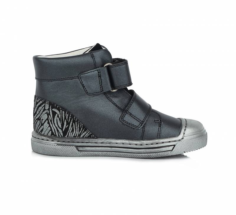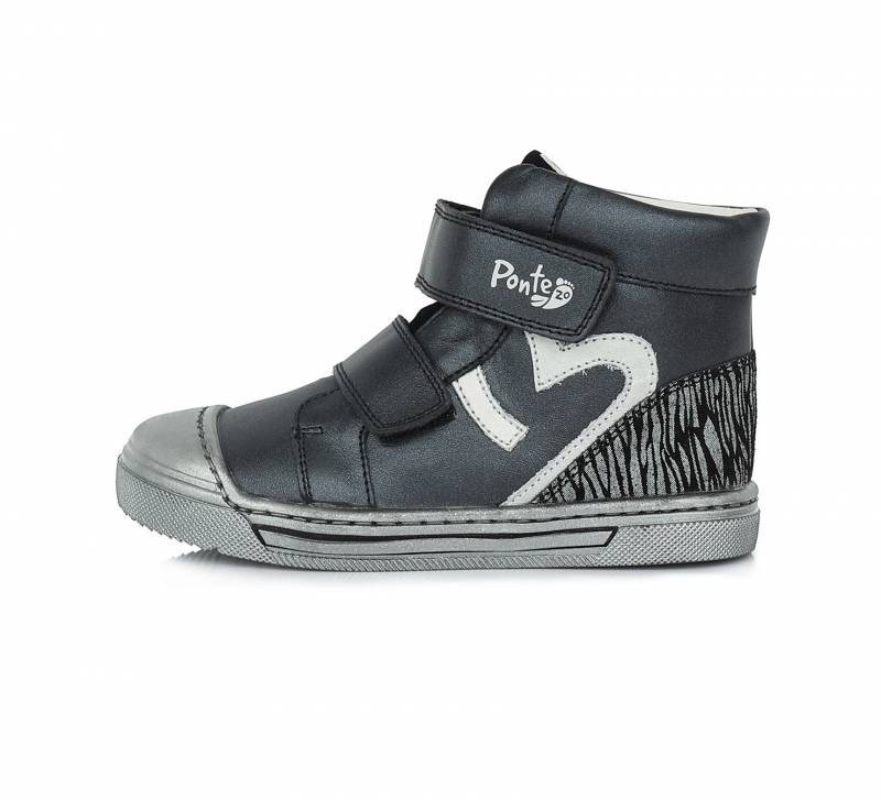 Szupinált gyerekcipő lányoknak, Sötét színben szürke szivecskés mintával. Magasszárú, de nem bélelt. A cipő orra erősített, így a cipő élettartamát is hosszabbítja, valamint a gyerek lábujjait is jobban védi. Természetes gumitalppal rendelkezik, ami jól tapad és strapabíró.
