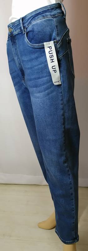 Női, kék színű, Push Up-os farmernadrág, amely jól kiemeli az alakot.