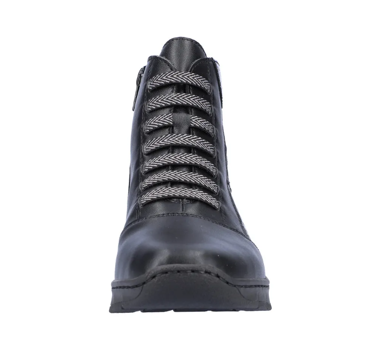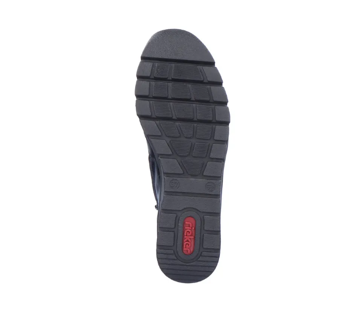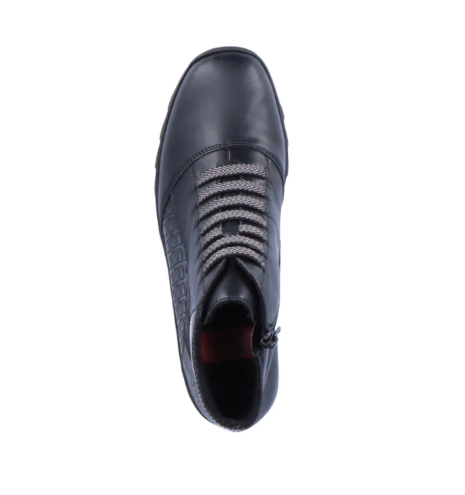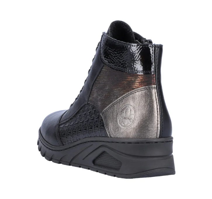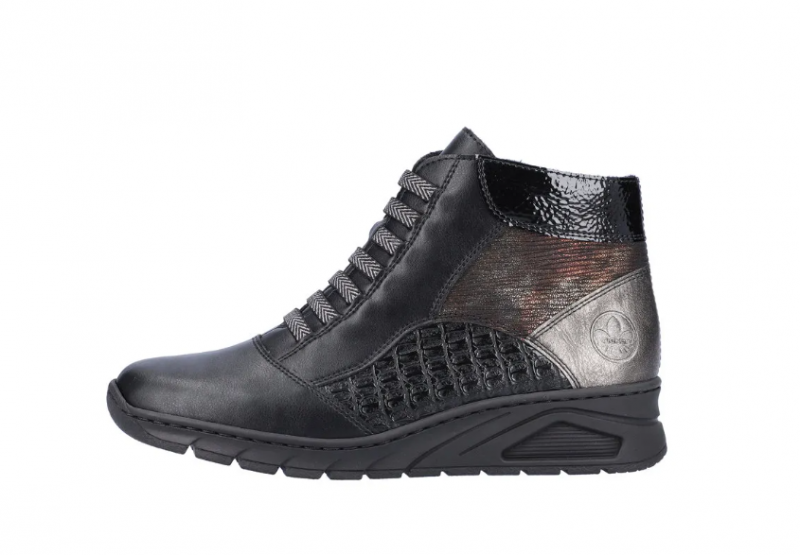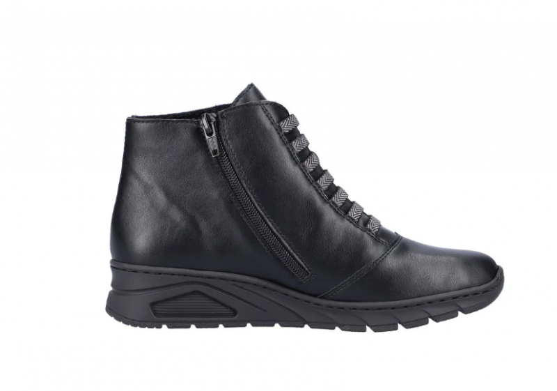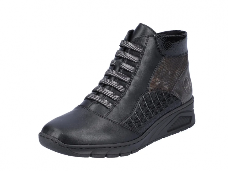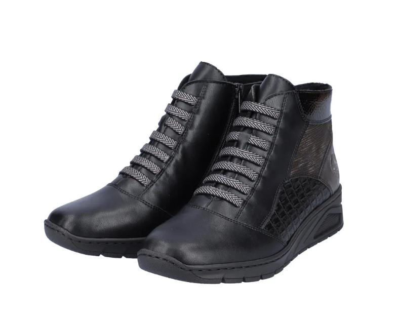 Nöi Rieker bokacipő vékony béléssel ellátva, többféle díszmintával az oldalán és dísz fűzővel. Sarokrésze emelt, szélessége keskeny lábakra való (E). Oldalán egy cipzár segíti a fel és le vételt. Könnyed, jól hajlik, ütéscsillapított valamint puha a belső talp.