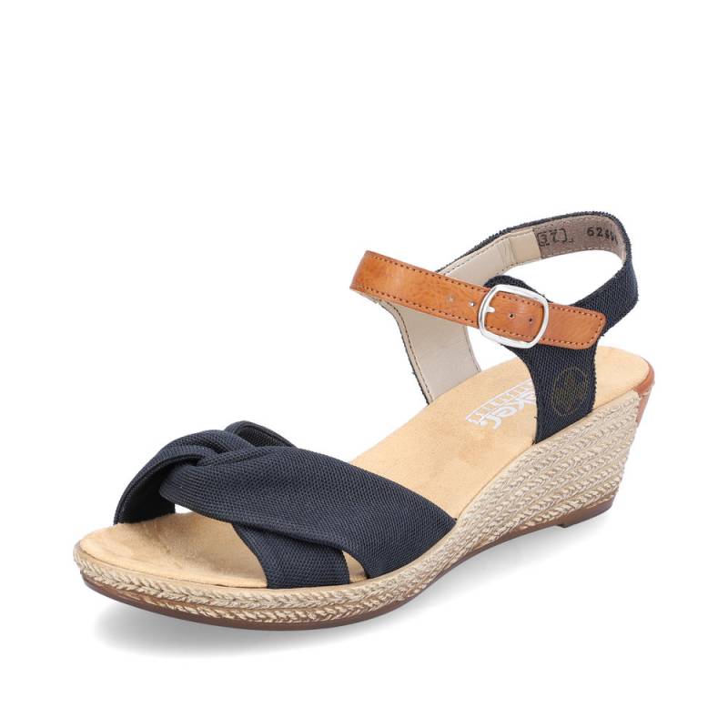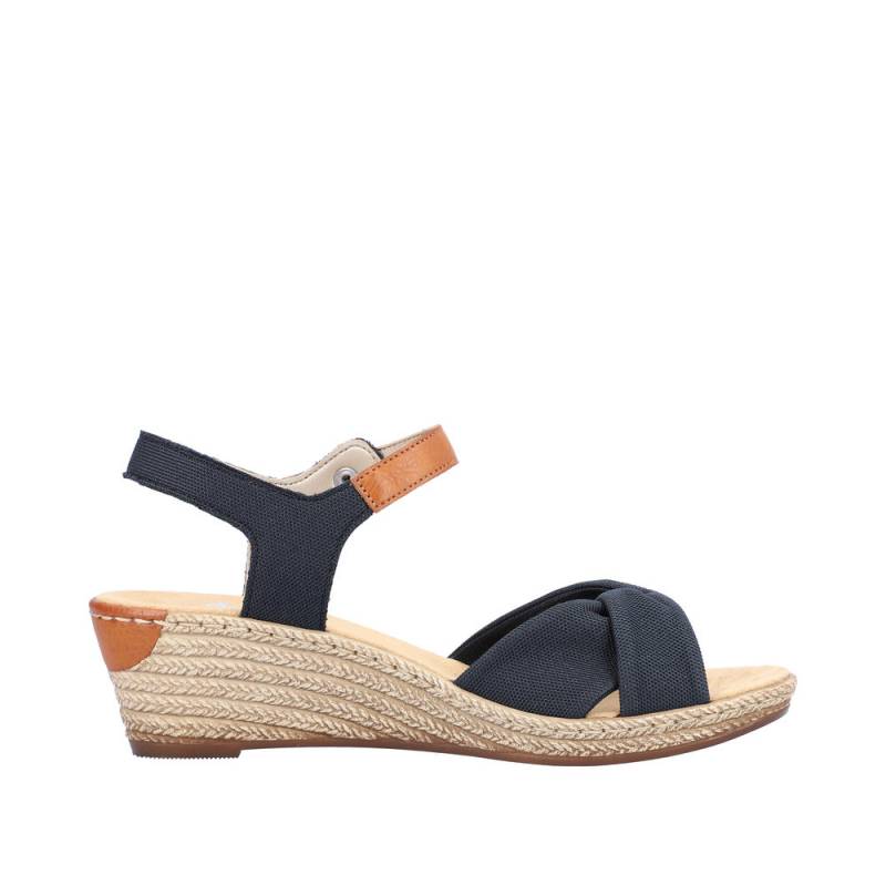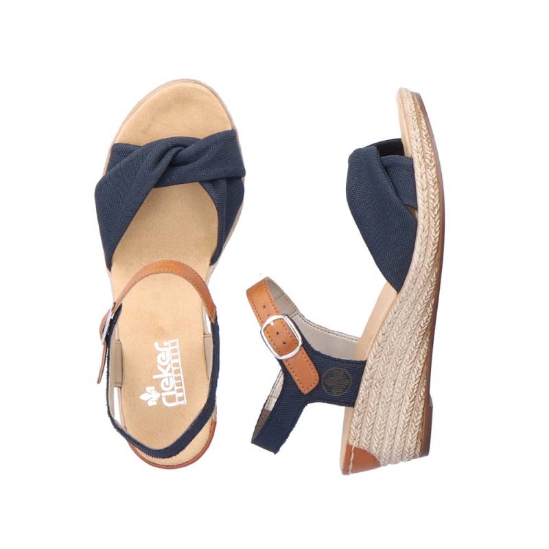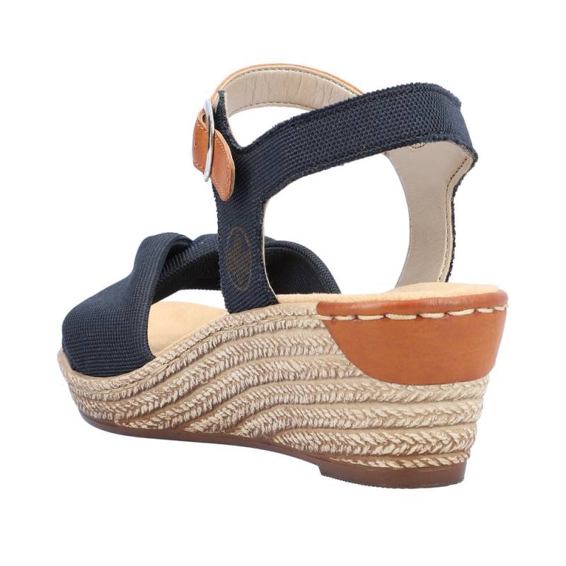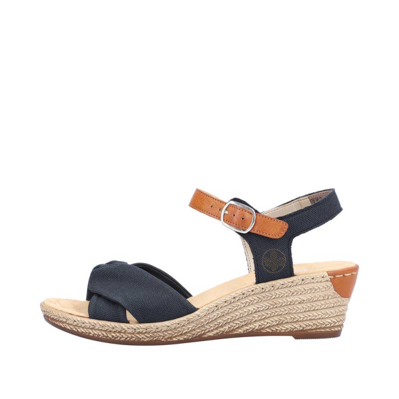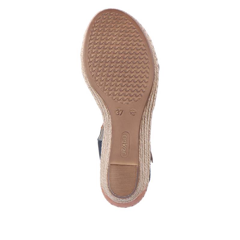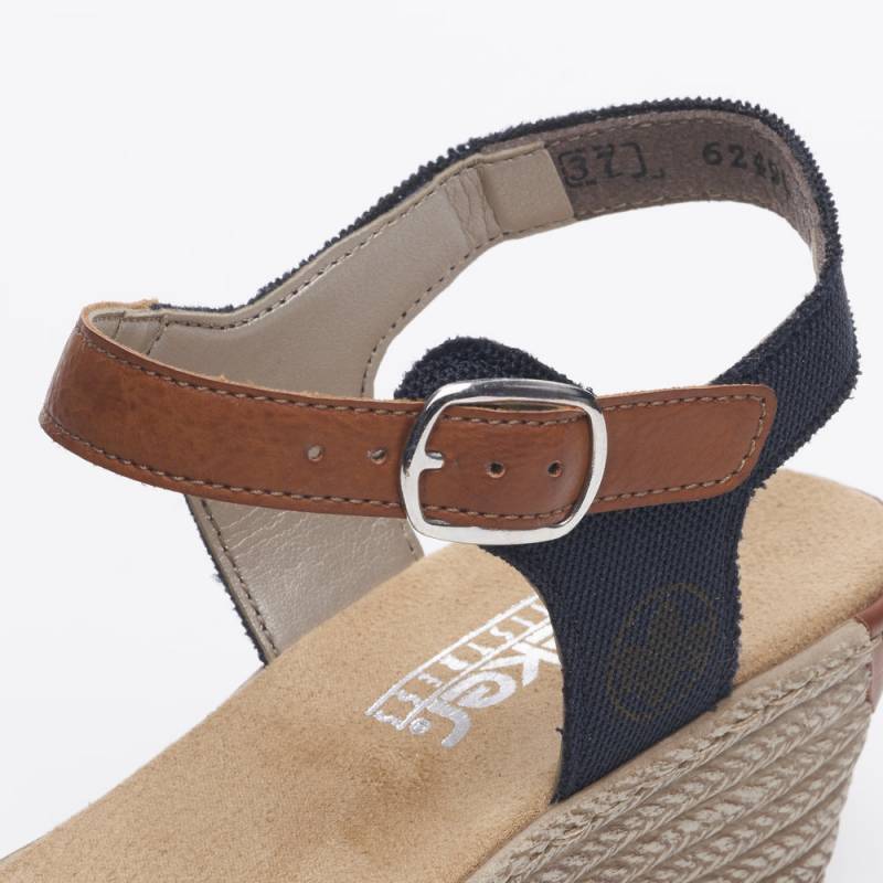 Női Rieker márkájú, tavaszi - nyári éktalpú szandál. Vászon anyagú pánttal, csattal állítható. Egész napos viselésre is ajánljuk.