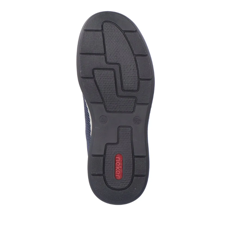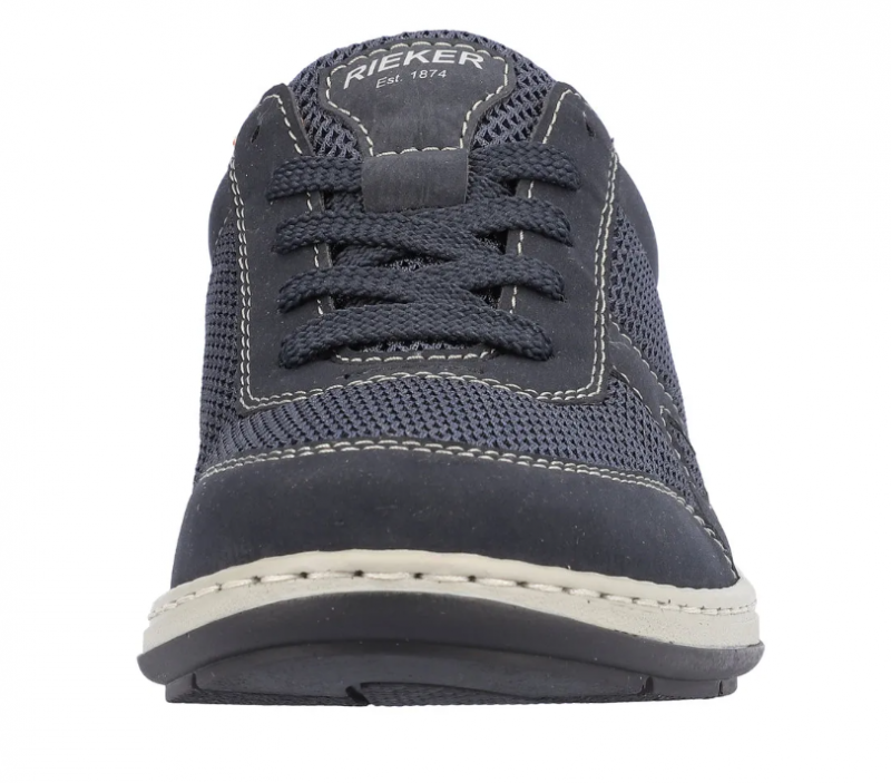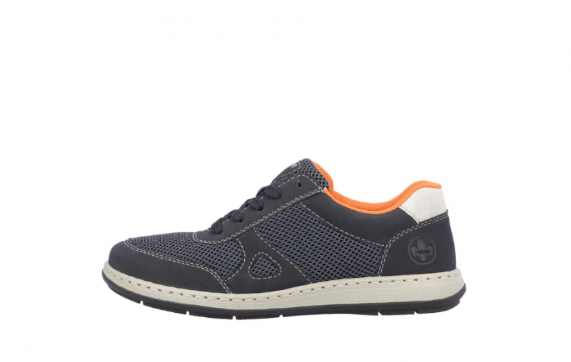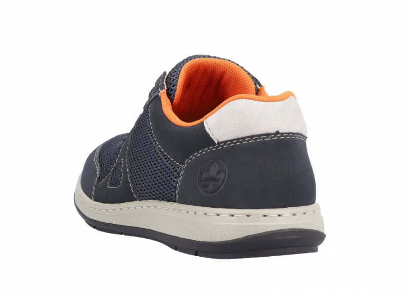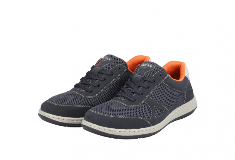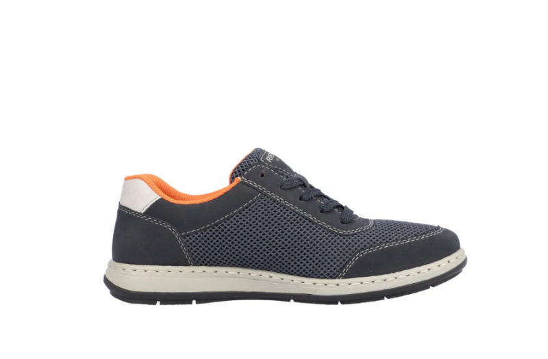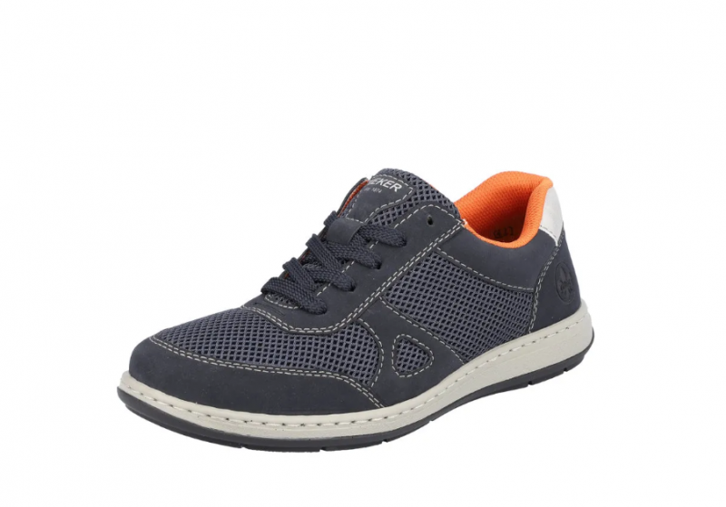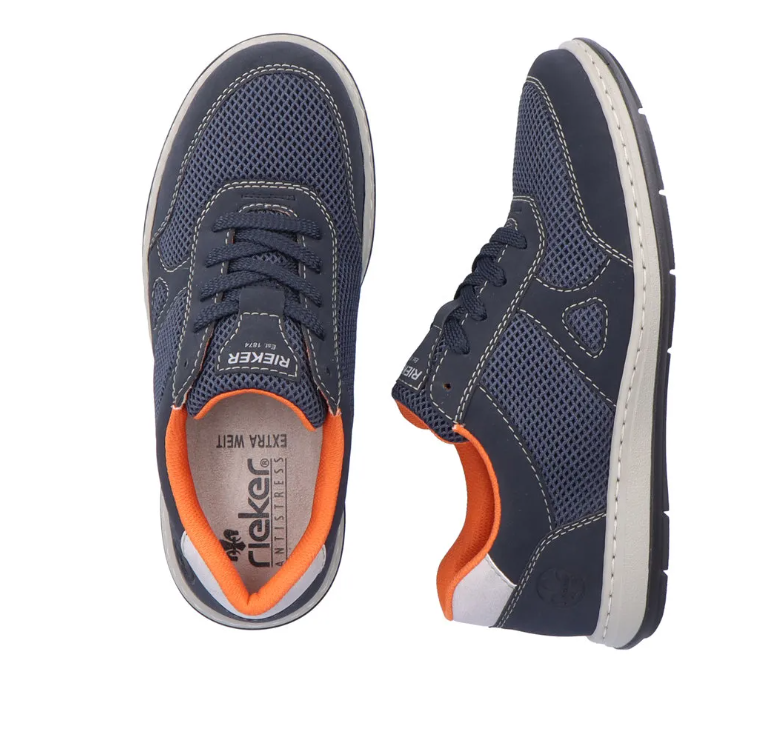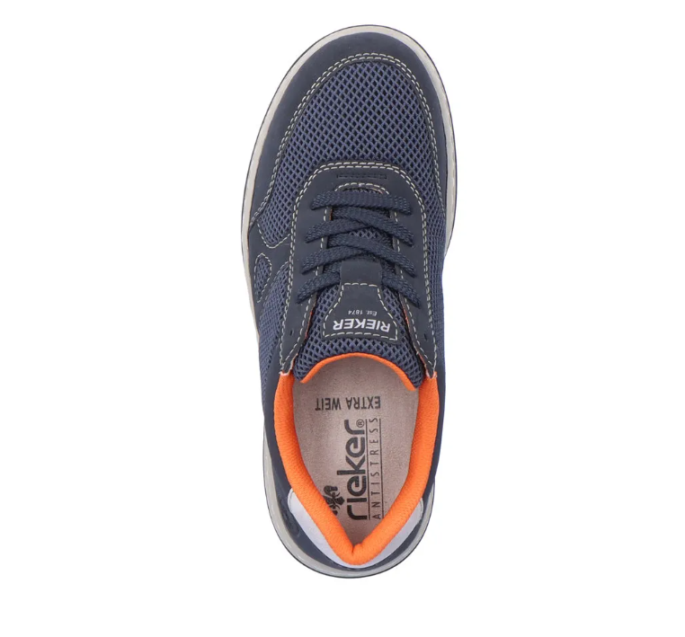 Széles lábakhoz kialakított Rieker férfi cipő. Kivül sötétkék, belül narancssárga, tavaszi/nyári időre ajánlott. A Rieker Antistress kényelmessé teszi a cipőt. Könnyű a kialakítása, jól hajlik, ütéscsillapított, és puha a talpa.
