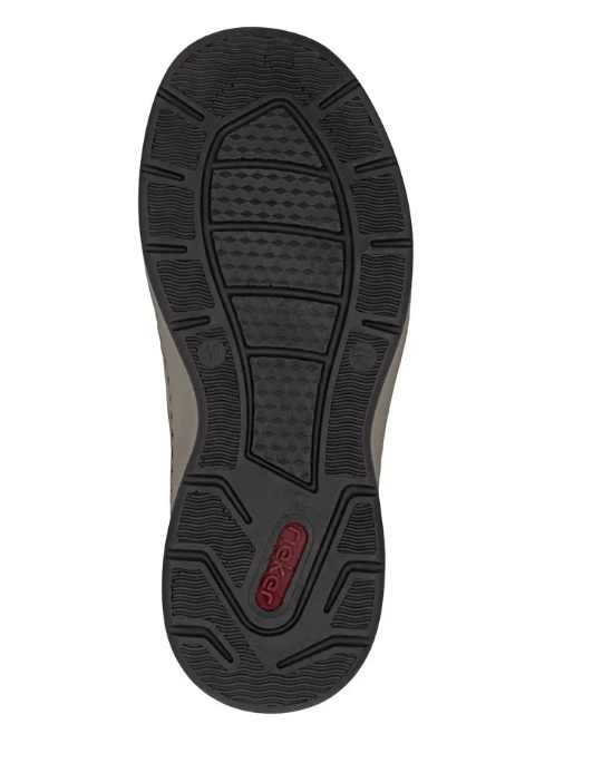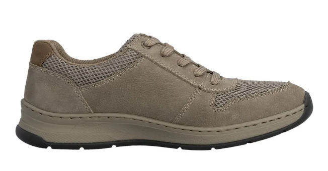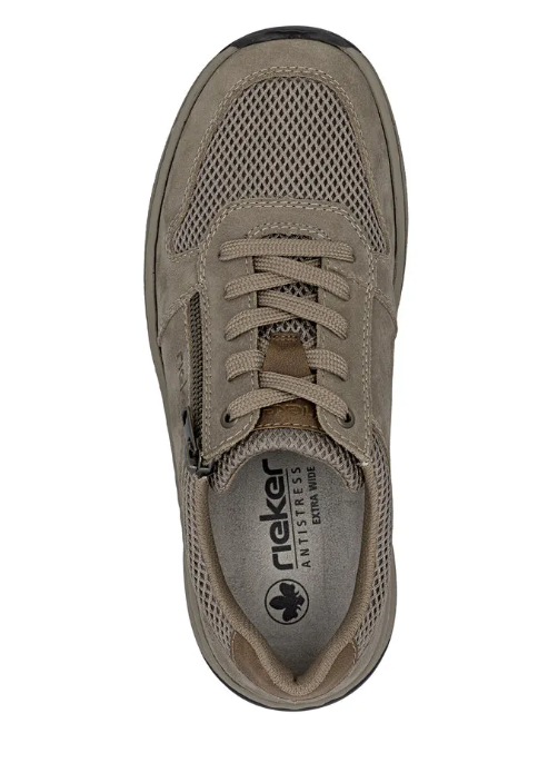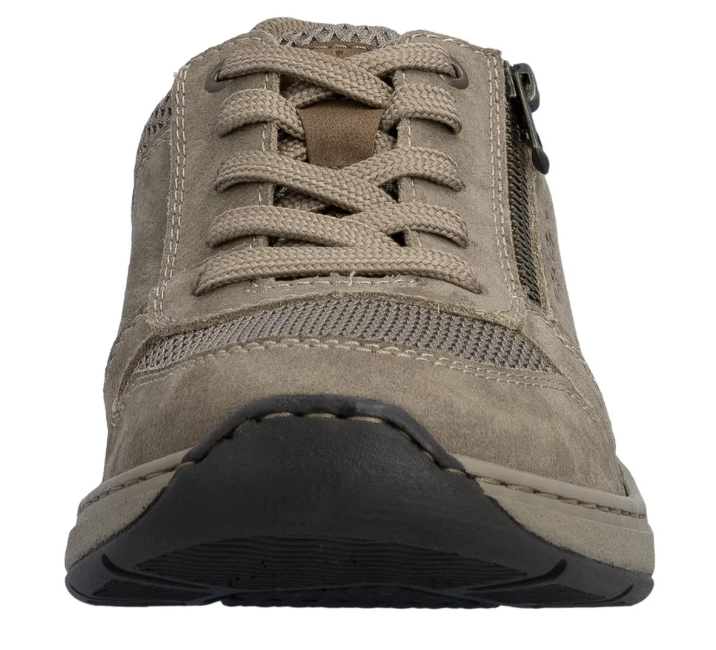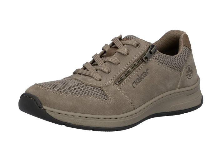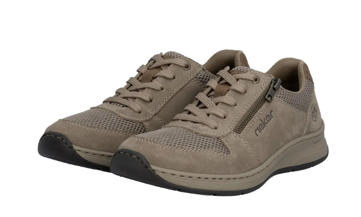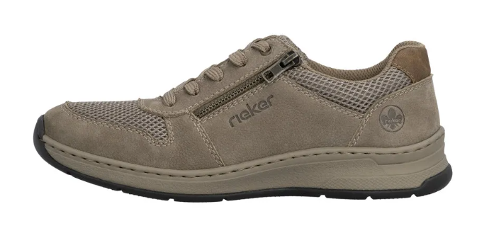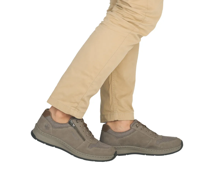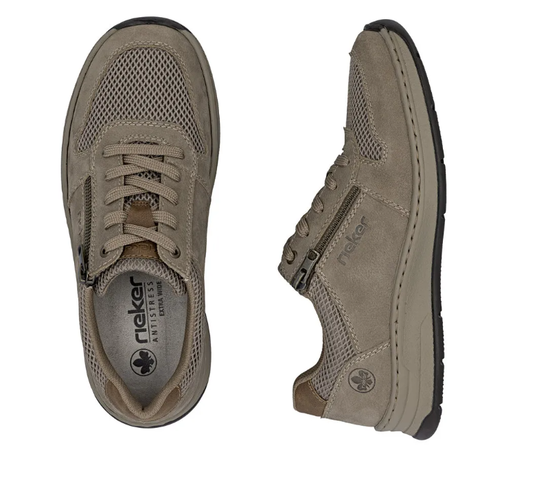 Szellősebb kialakítású férfi bőr cipő a Rieker-től. Vászon és bőr felsőrésszel rendelkezik, cipőfűzővel, valamint zipzárral működik, hogy ne kelljen minden egyes alkalommal újra kötögetni. Extra széles lábfejrésze van, Rieker antistress kialakítással rendelkezik. Ütéscsillapított a talpa, az egész cipő pihekönnyű, valamint jól hajlik a talpa, és kényelmes.
