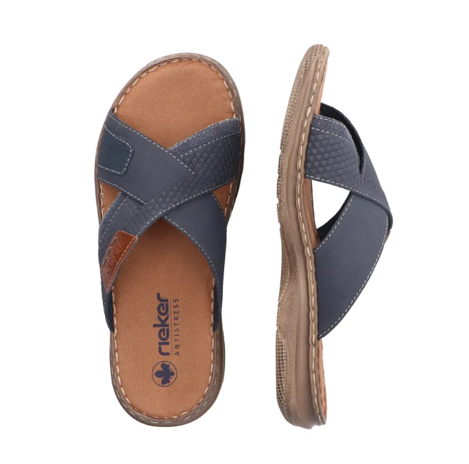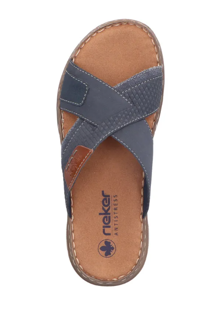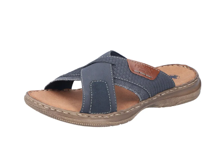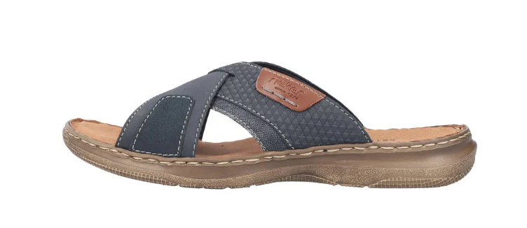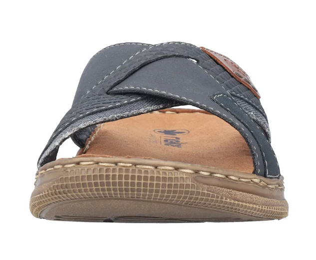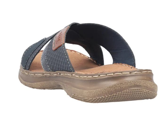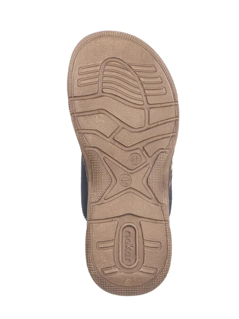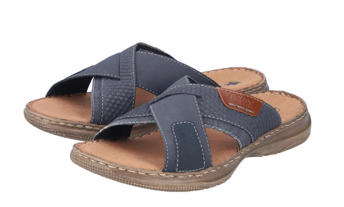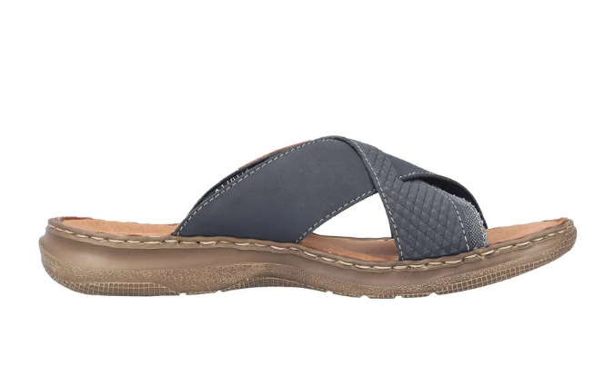Kényelmes, egyszerű Rieker férfi papucs. Sötétkék színű, lapos a talpa, talpbetétje pedig igazán puha. Nagyon könnyű a kialakítása, ütéscsillapítottak a léptek benne, talpa kiválóan jól hajlik.