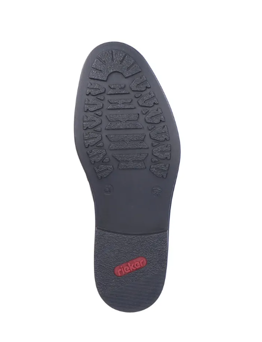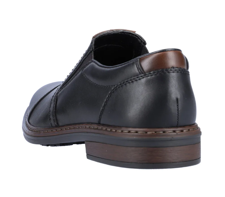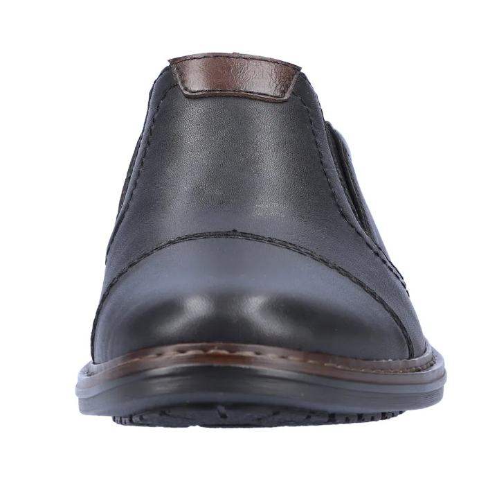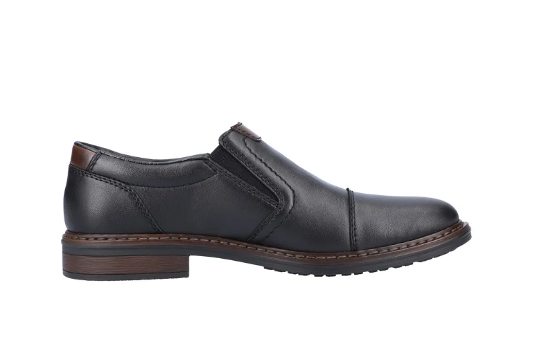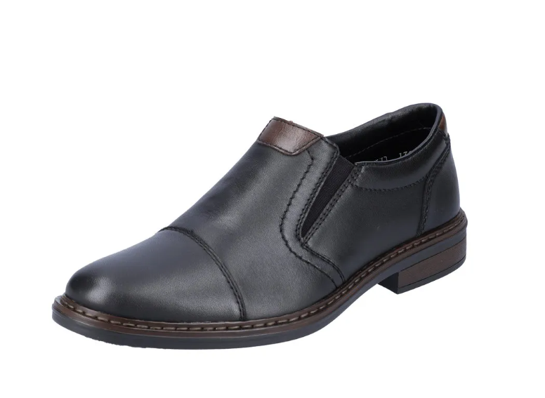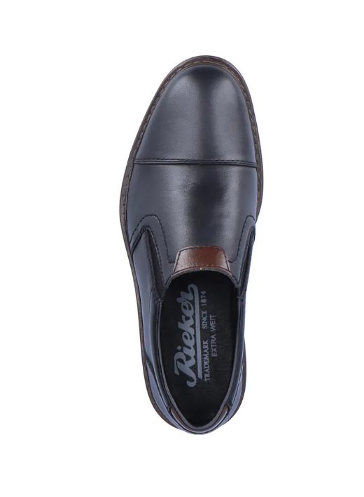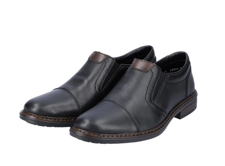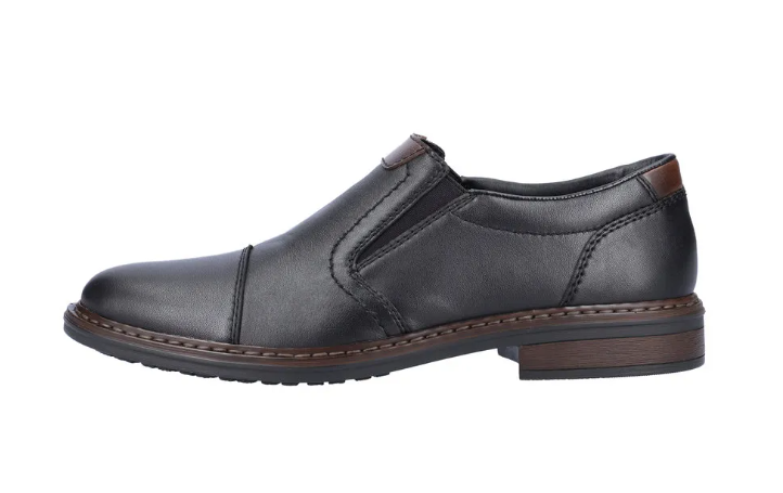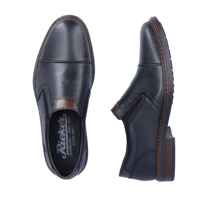 Széles (H) férfi Rieker cipő fekete színben, barna kiegészítéssel. Bőrből készült, nincs hozzá cipőfűző, se zippzár, helyette nyúlékony anyaggal van kiegészítve két oldalt, hogy könnyű legyen felvenni, és illeszkedjen a lábhoz. A Rieker antistress arra lett kitalálva, hogy kényelmes legyen mindennapi viselet közben is a cipő. Könnyű anyagból készül, jól hajlik, ütéscsillapított és puha a talpbélése.