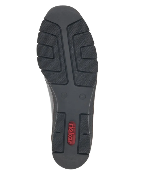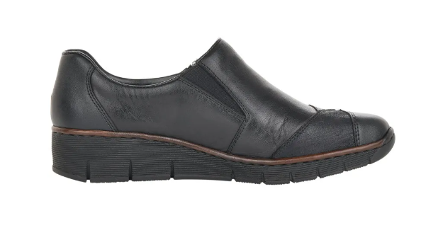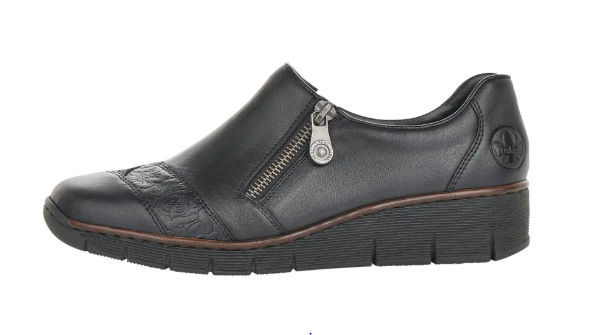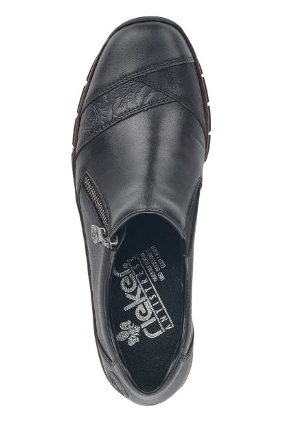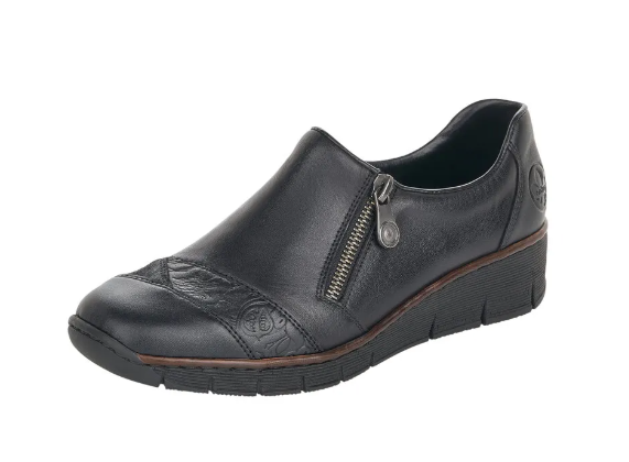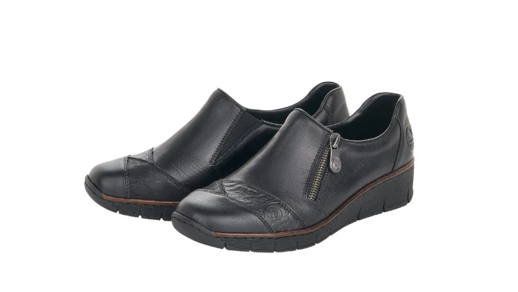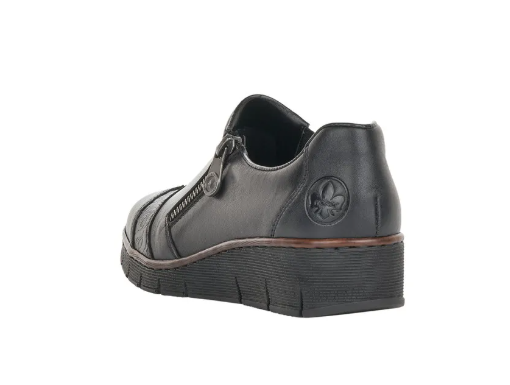 Fekete Rieker bőrcipő keskeny lábakra. Zippzár segítségével könnyen felvehető, másik oldalán pedig egy gumi van, ami idővel igazodik a lábhoz. Az orrán minimális díszítés található. Talpa jól hajlik és ütéscsillapított, belső talpbetétje pedig puha és kényelmes.
