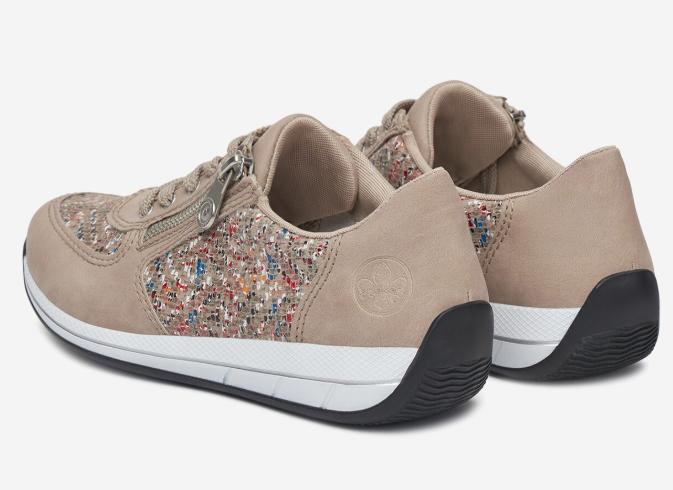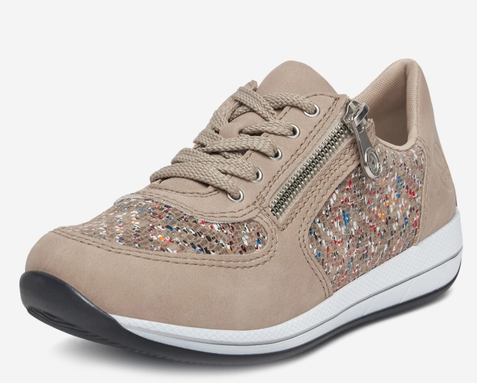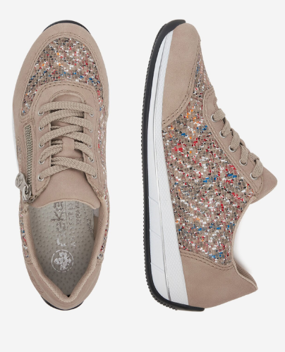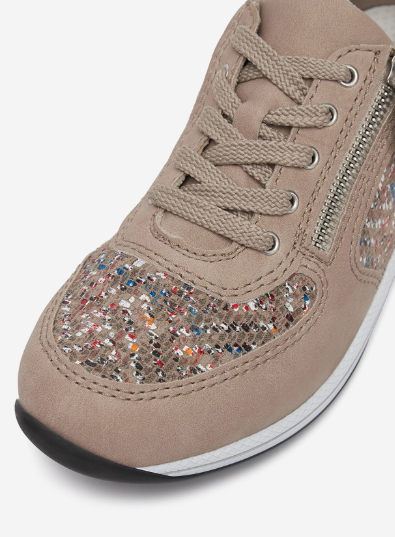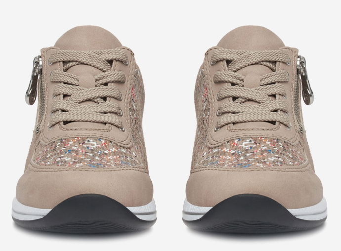 Sportos tornacipő jellegű női Rieker félcipő, díszes bézs színben. A zippzárnak köszönhetően egyszerűen fel és le vehető. Átmeneti időszakokra kiváló. Könnyed kialakításának köszönhetően nem terheli meg a lábat, talpa jól hajlik és ütéscsillapított, valamint a legfontosabb az, hogy kényelmes.