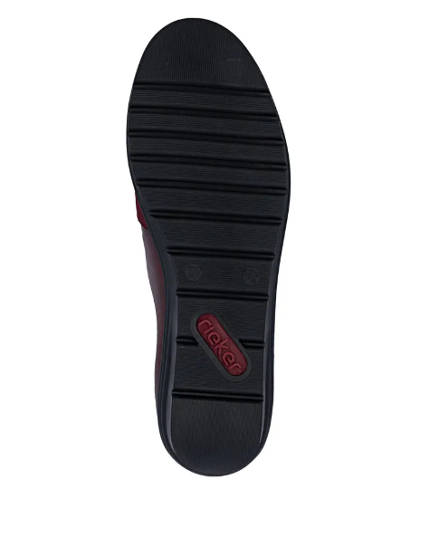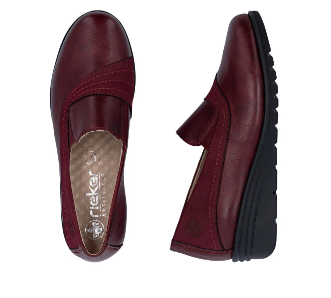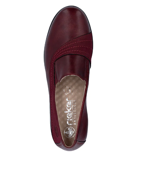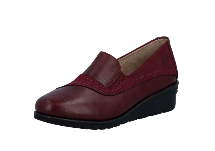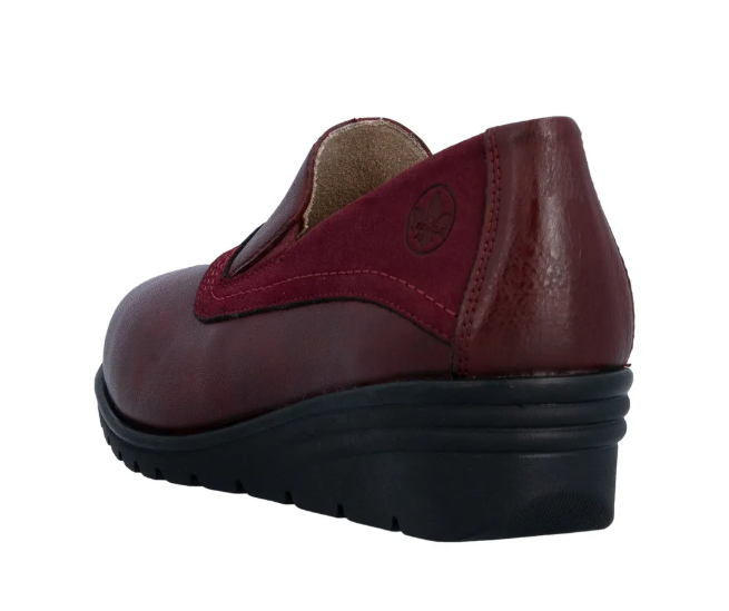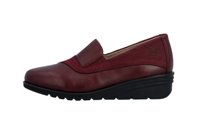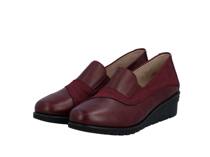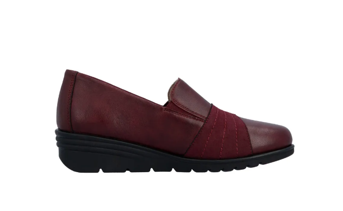 Bordó színű női félcipő közepesen emelt sarokkal, belebújos kialakítással. Két nyúlékony rövid csík van az oldalán, az egyszerűbb felvételhez. Normál lábszélességhez ajánlott (F). Bőrből készült a felsőrésze, és a belseje is.
