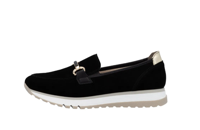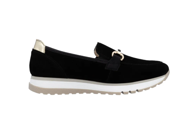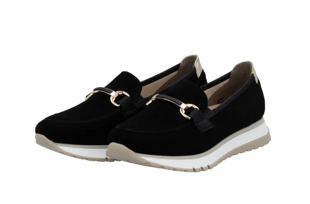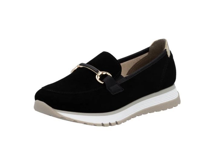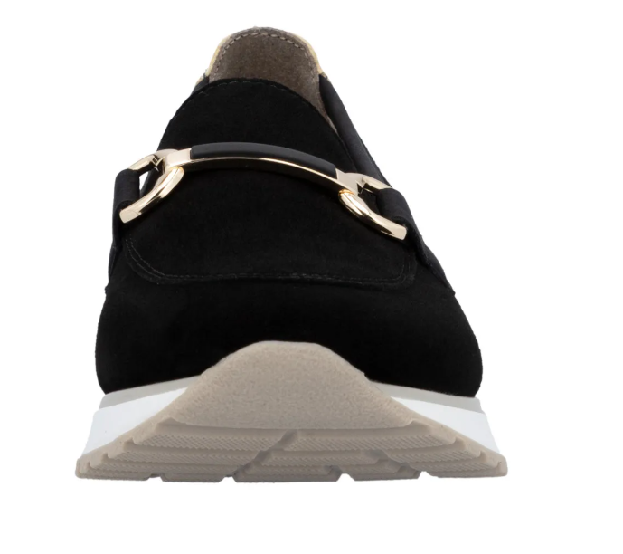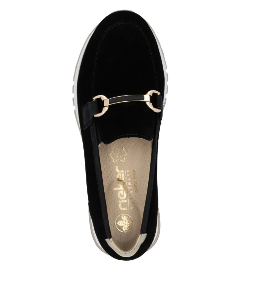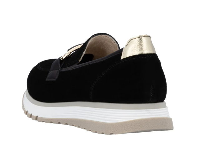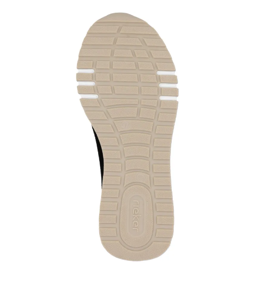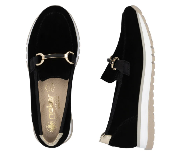 Lény elegáns ezzel a kiváló minőségű Rieker félcipővel!.Gyönyörű fekete velúrbőrből készült, talpbetétje is kipárnázott bőrből van. Talpa kissé magasított, és jól tapadó gumiból készült, a világos színe pedig egy kis sportos szellemet ad a cipőnek. A cipő idővel tágul egy keveset.