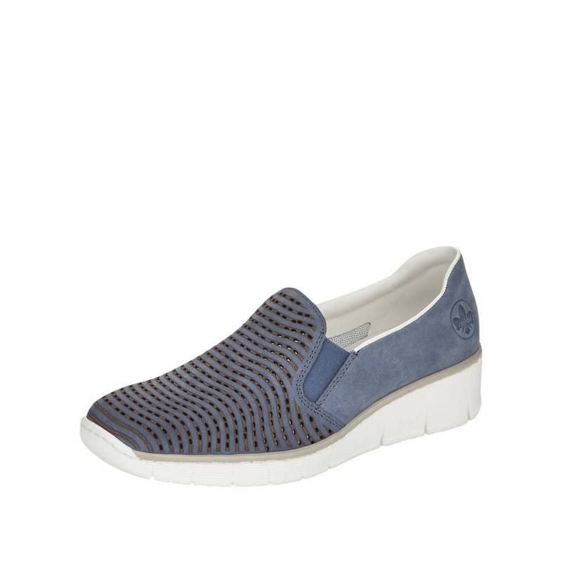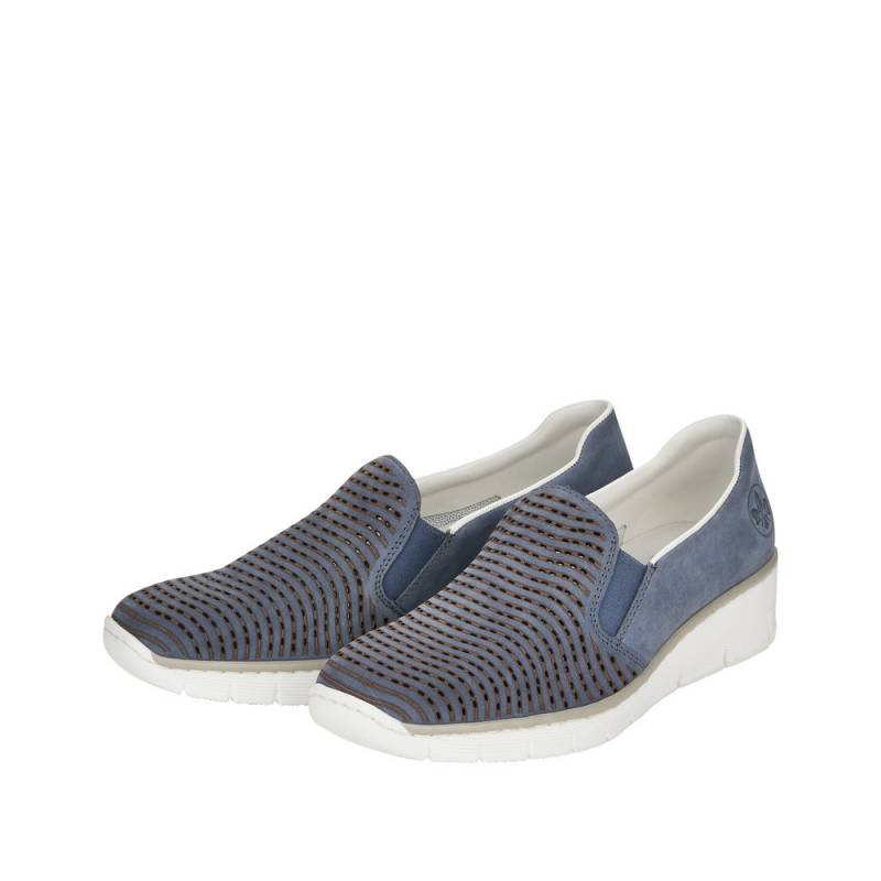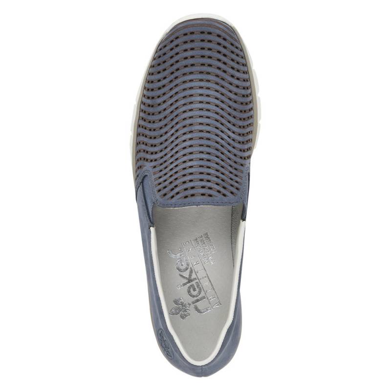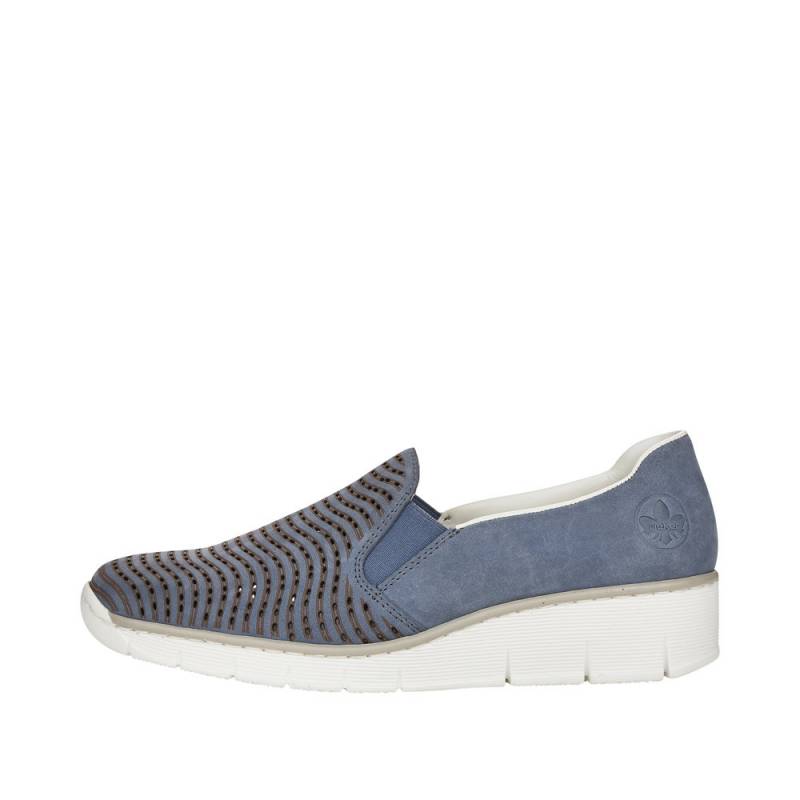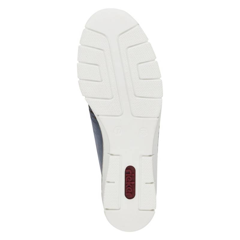 Tavaszi - nyári - őszi egésznapos viseletre is ajánlott, kék színű belebújós női Rieker félcipő.