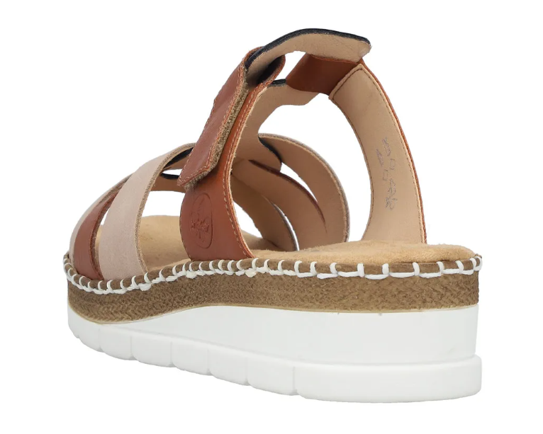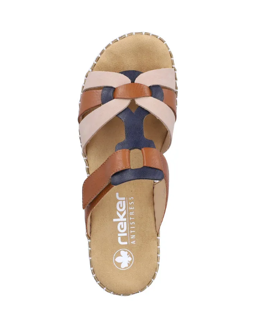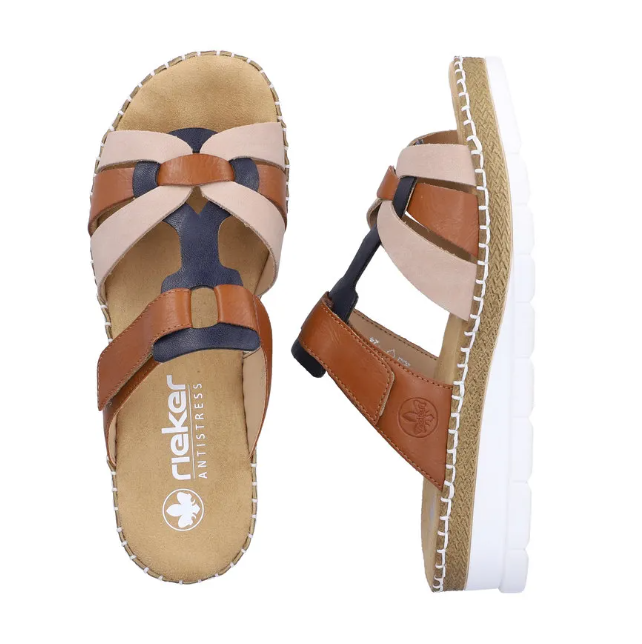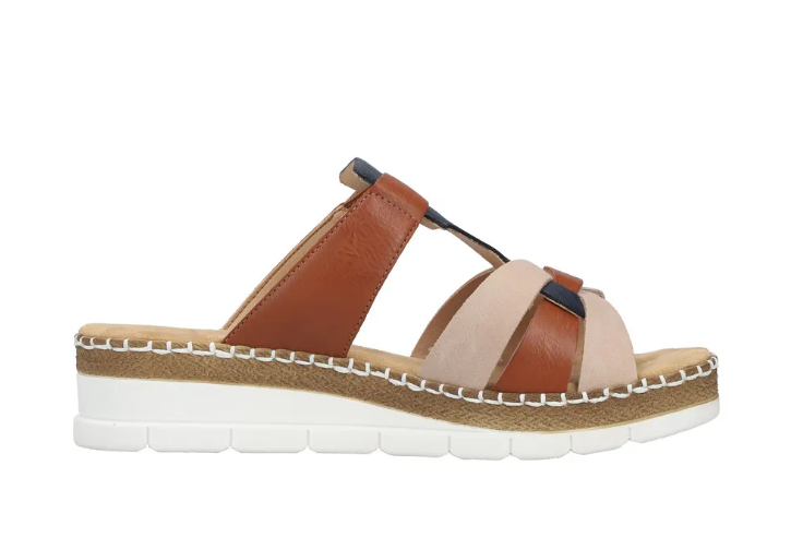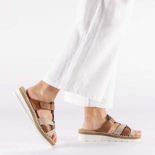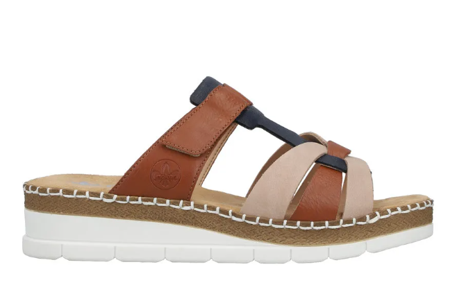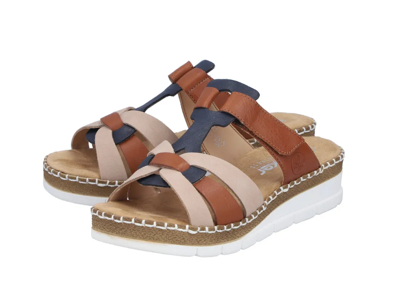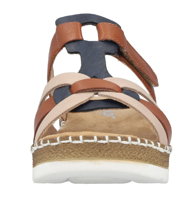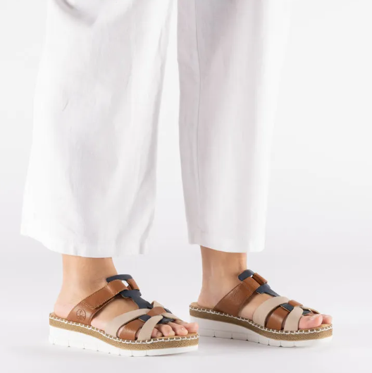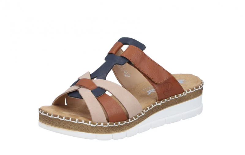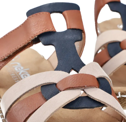 Tépőzáras női szandál, a kellemes nyári időre. Sarokrésze enyhén magasított, lábfejrésze keskeny. Barna-kék-fehér színű. Talpbetétje finom puha, talpa jól hajlik, valamint ütéscsillapított. A cipő kialakításának köszönhetően könnyű, nem húzza le a lábat.