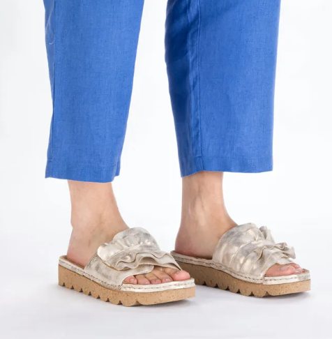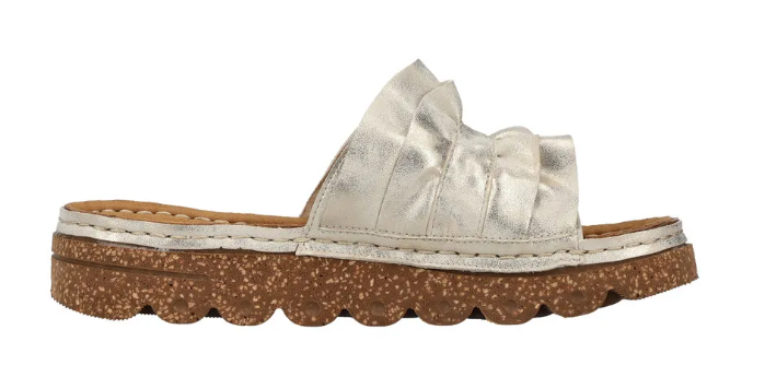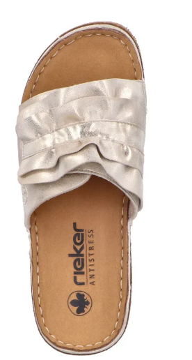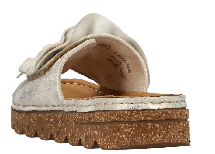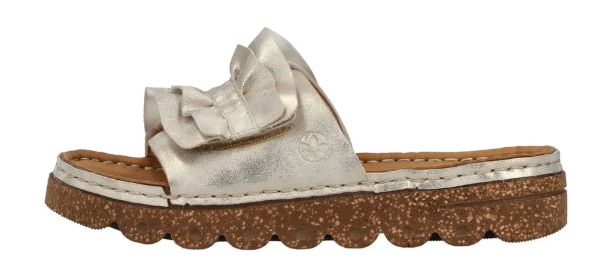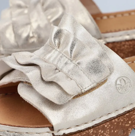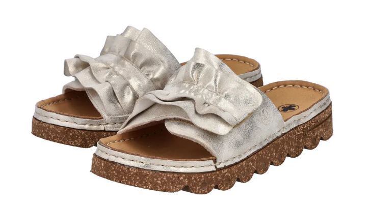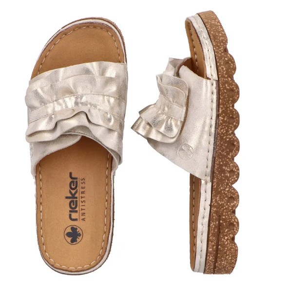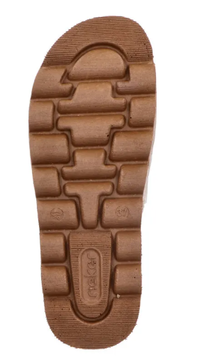 Díszes női tavaszi nyári utcai papucs a Riekertől, mindenapi használatra kiváló. A sarka enyhén magasított, normál lábfejszélességre készült, tépőzárral lehet állítani, talpbetéte kellemesen puha. Rieker antistress tulajdonságaival rendelkezik: pihekönnyű, sarka ütéscsillapított, talpa rugalmas.