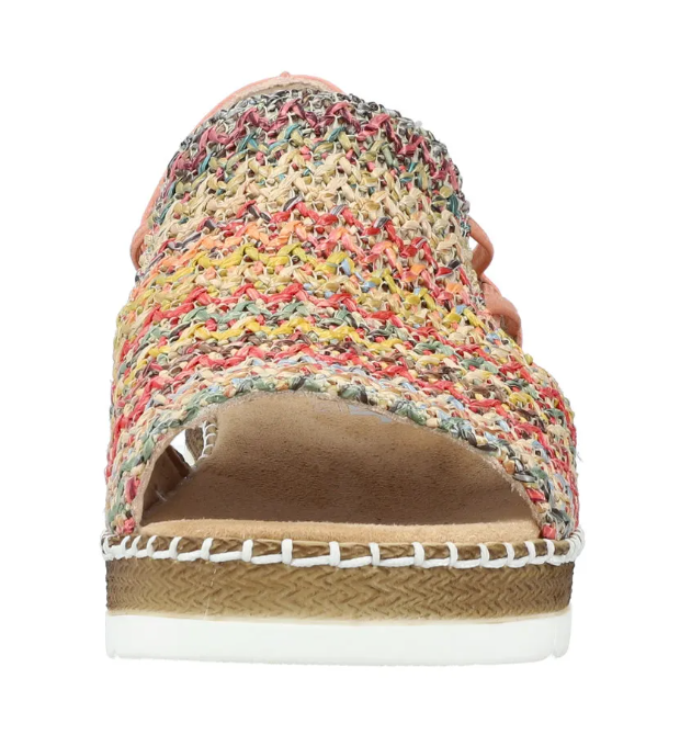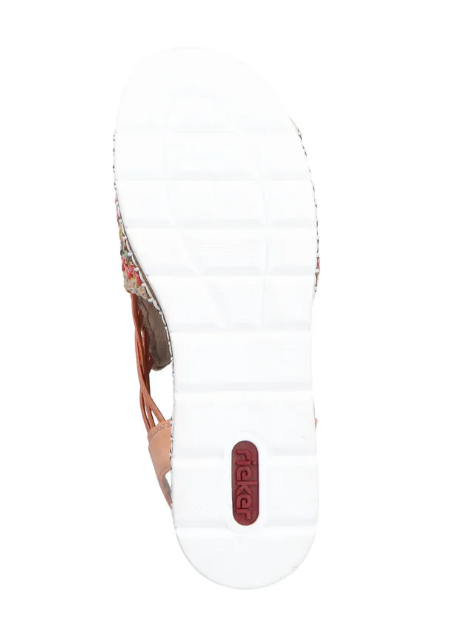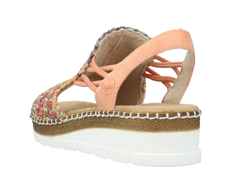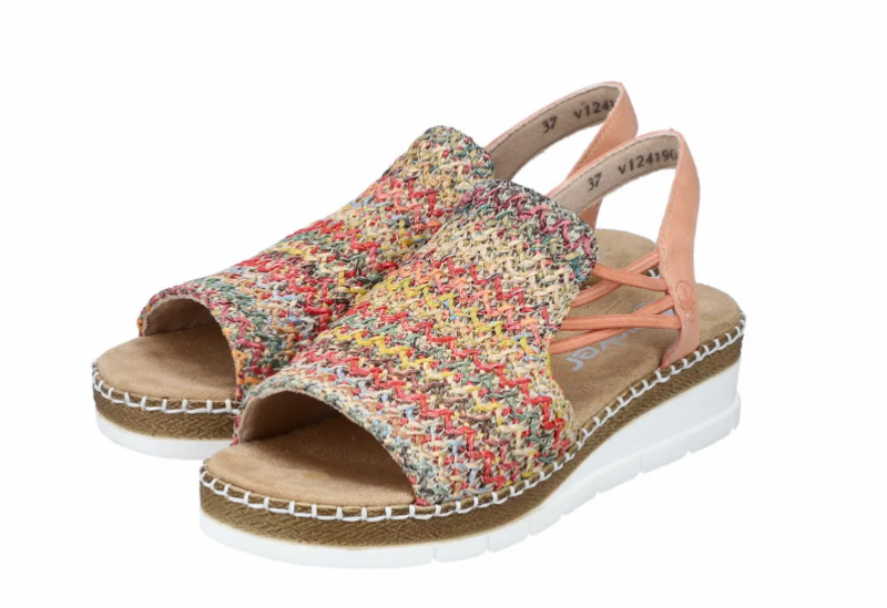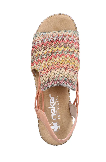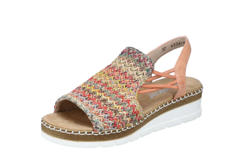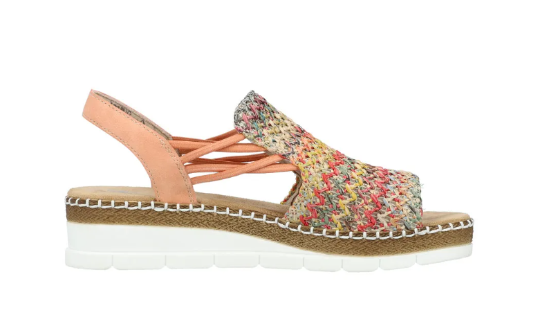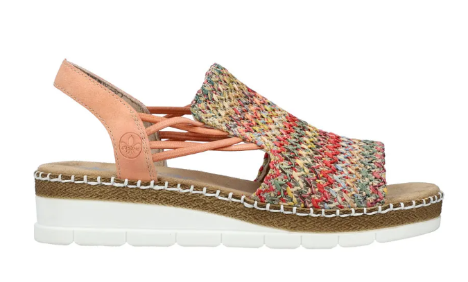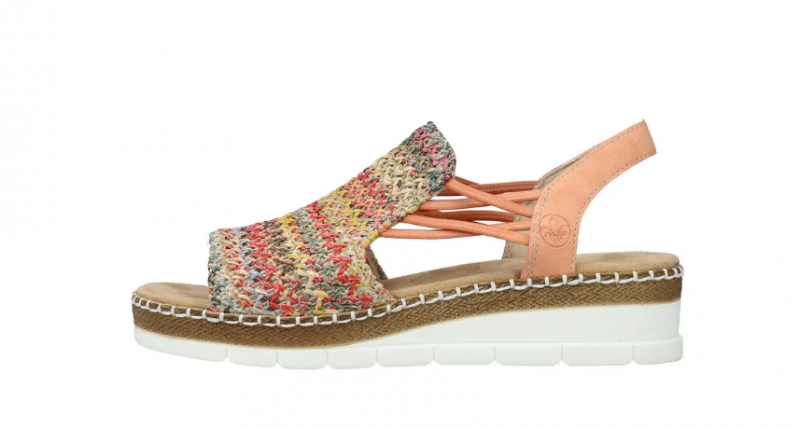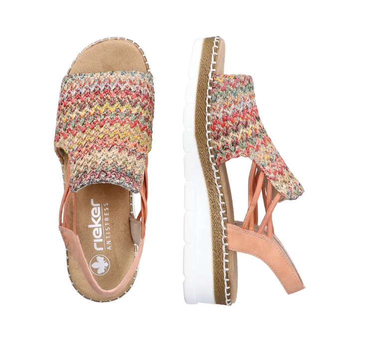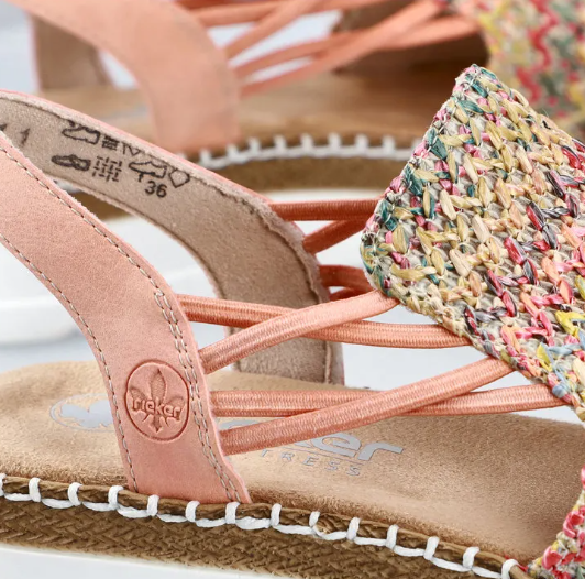 Ez egy olyan szandál, ami normál lábszélességre készült, gumis kialkakítással, hogy szépen igazodjon a lábhoz, és egyszerű legyen felvenni. Fonott mintás a felsőrésze, sarka kissé emelt. Pihekönnyű, kevésbé hajlik, mint a legtöbb Rieker cipő. Talpa ütéscsillapított, talpbetétje pedig jó puha.