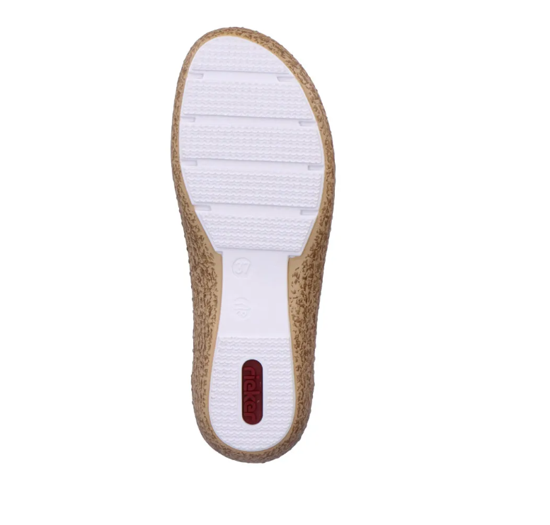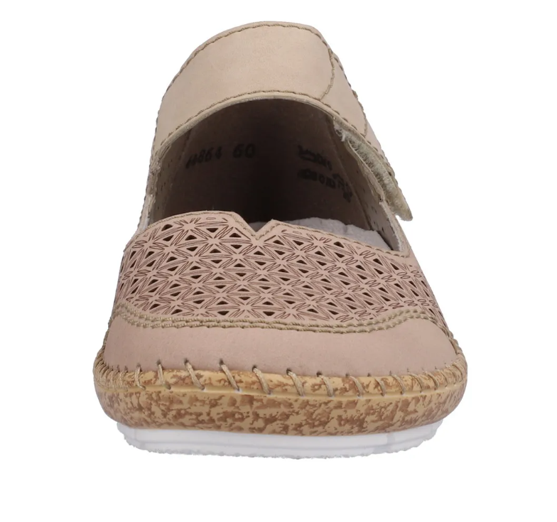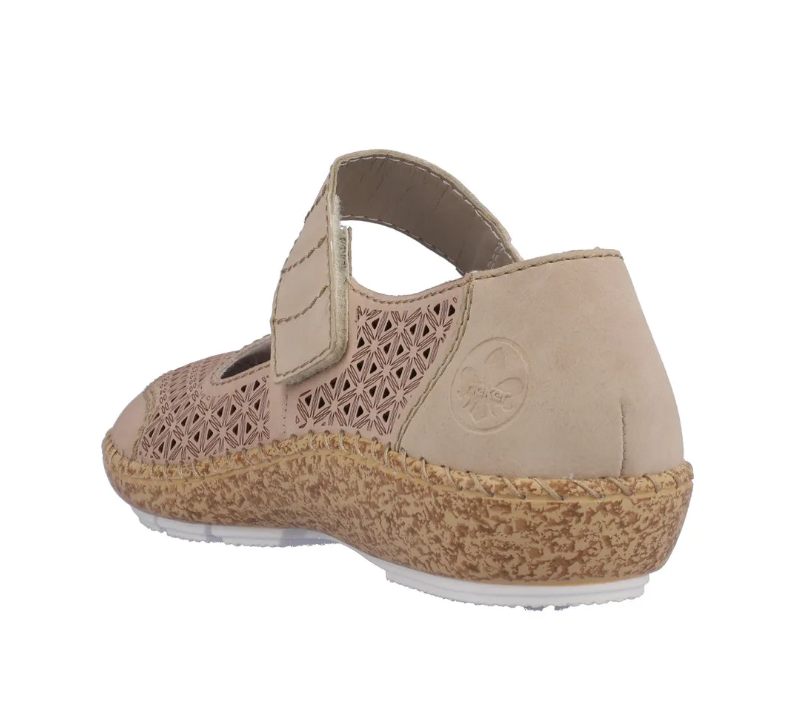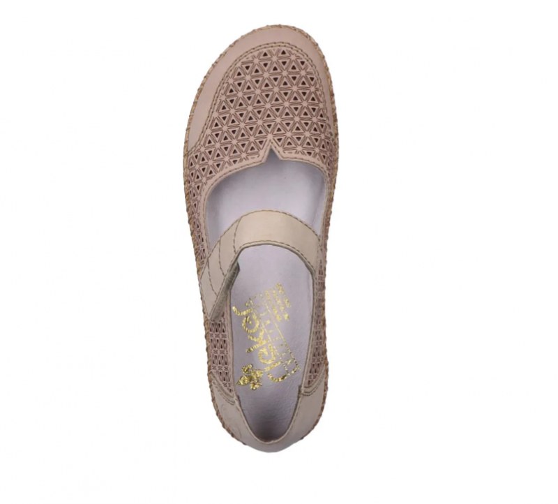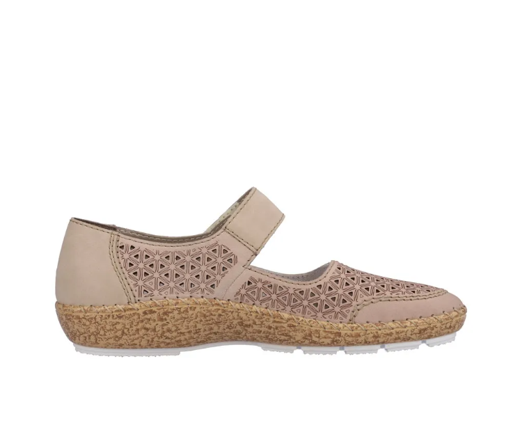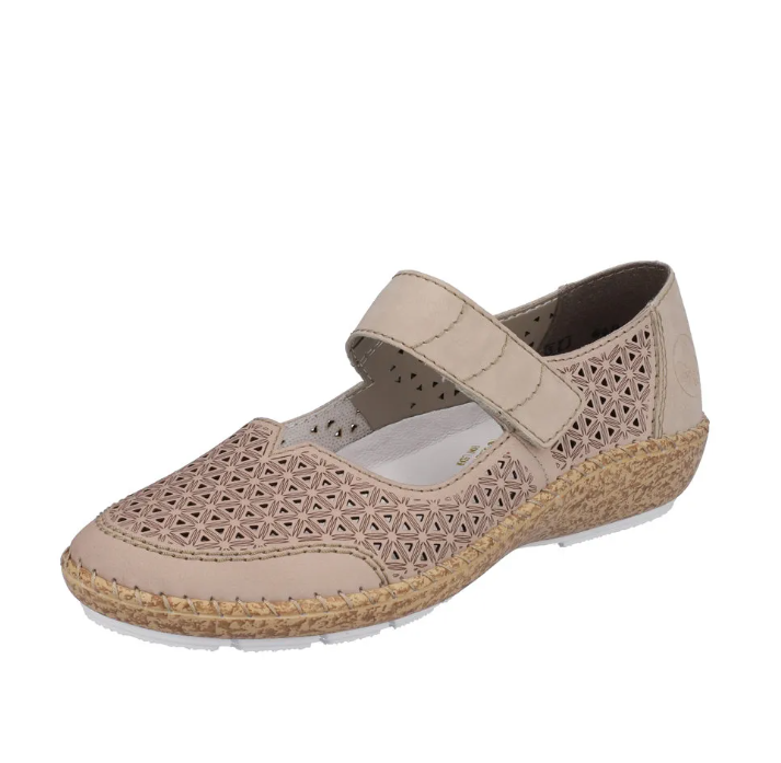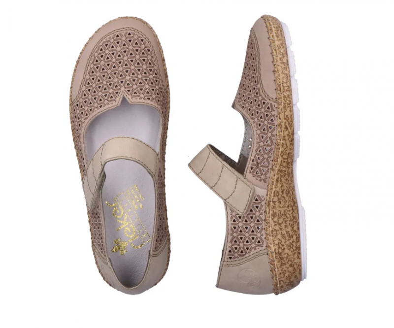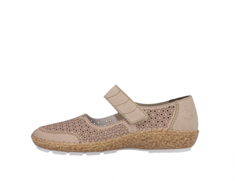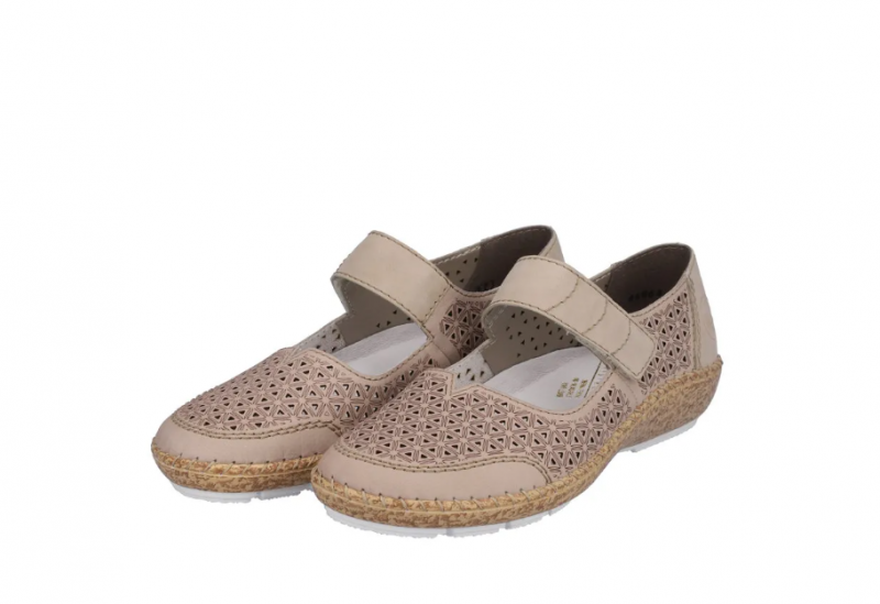 Bézs színű Rieker női lyukacsos félcipő, pánttal. Keskeny lábakra ajánlott, bőrből készült a felsőrésze. A Rieker Antistress arról gondoskodik, hogy kényelmes legyen minden lépés a cipőben. Könnyű a kialakítása, jól hajlik a talpa, valamint kényelmes a talpbetétje, így egész napos viselet sem ejt gondot.