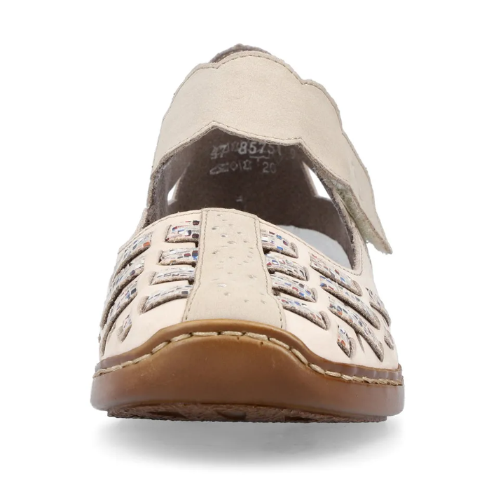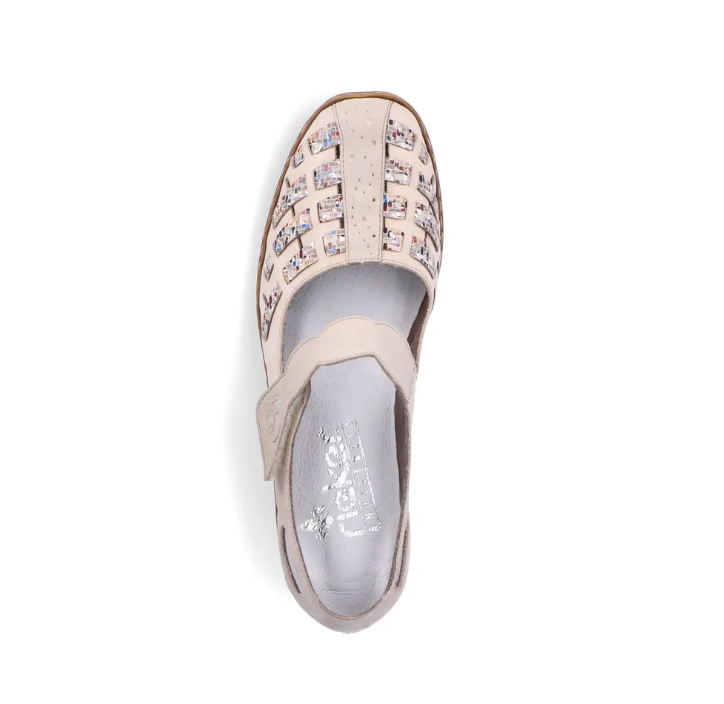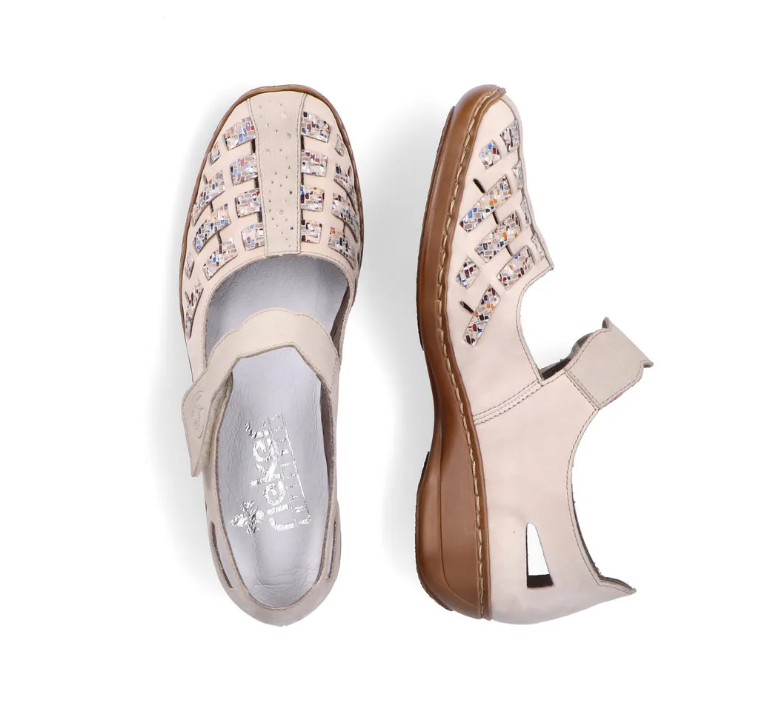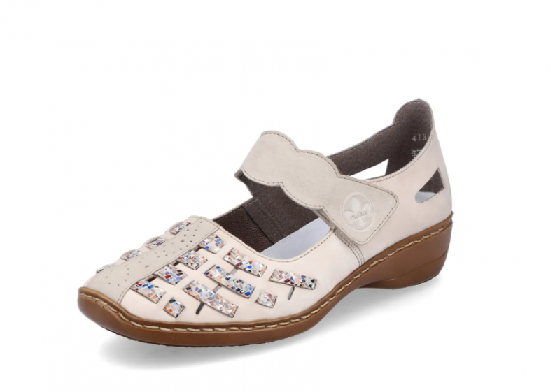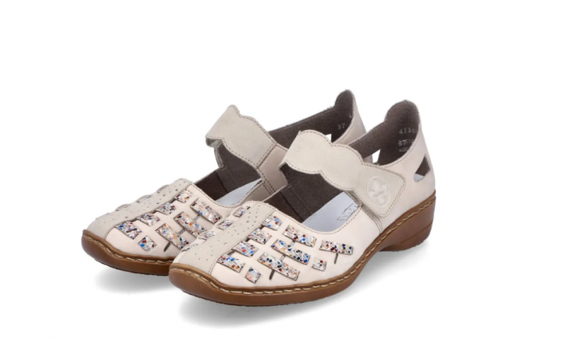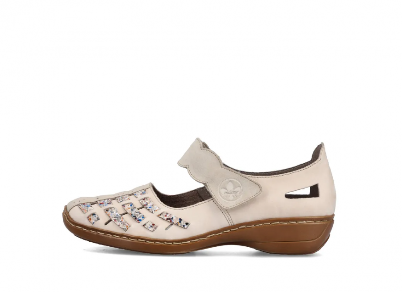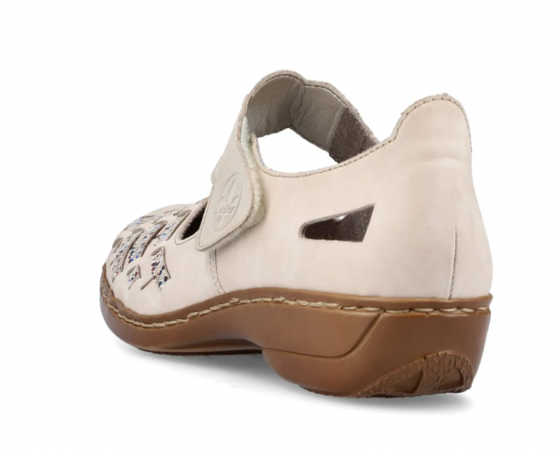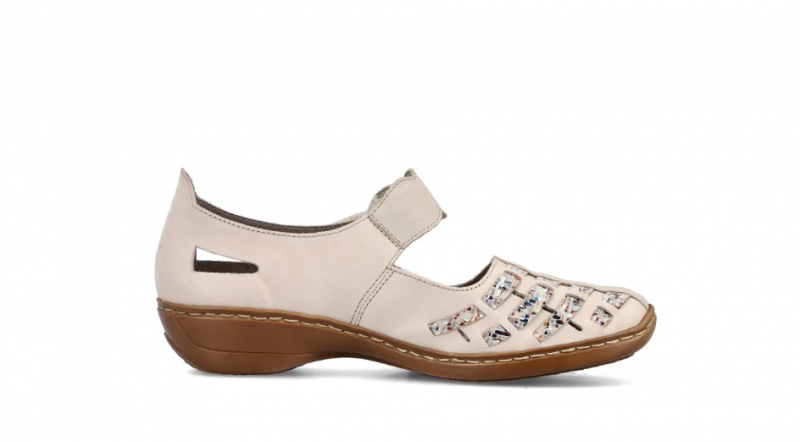 Keskeny lábra ajánlott női Rieker lyukacsos félcipő. Színe fehér, bézs, felső része bőrből készült. Tépőzárral működik. Rieker Antistress kialakítással ellátott, hogy mindennap kényelmes legyen. A cipő könnyű, talpa ütéscsillapított, jól hajlik, belső talpbélése pedig puha, kényelmes.