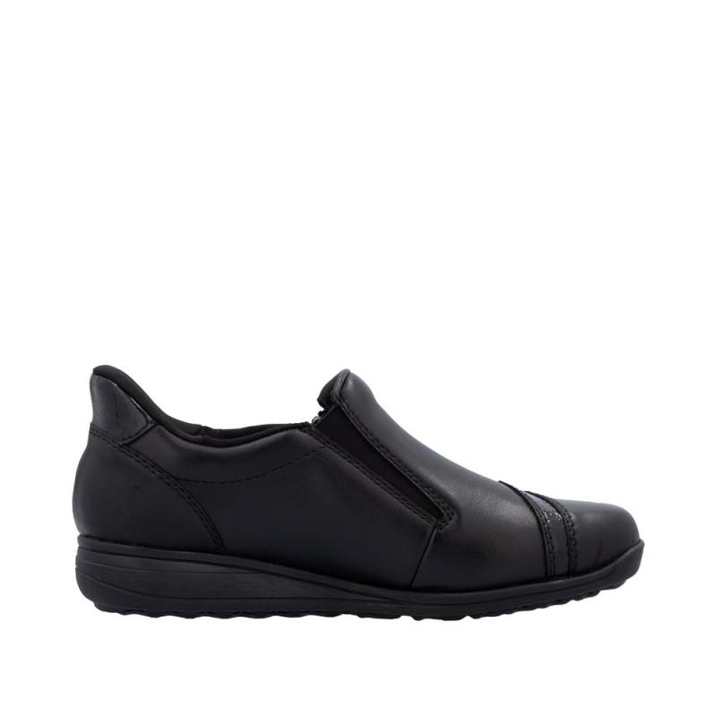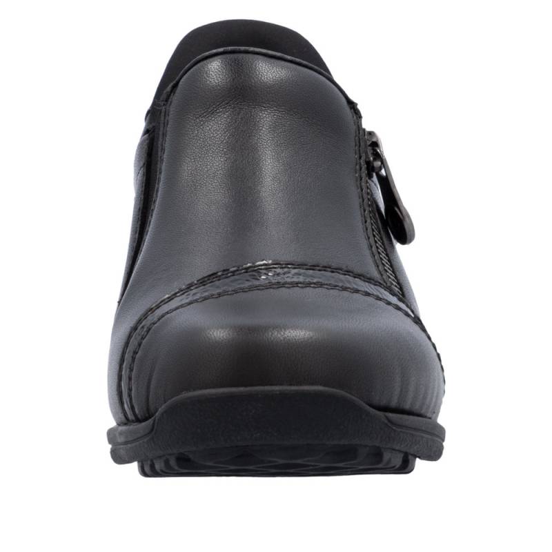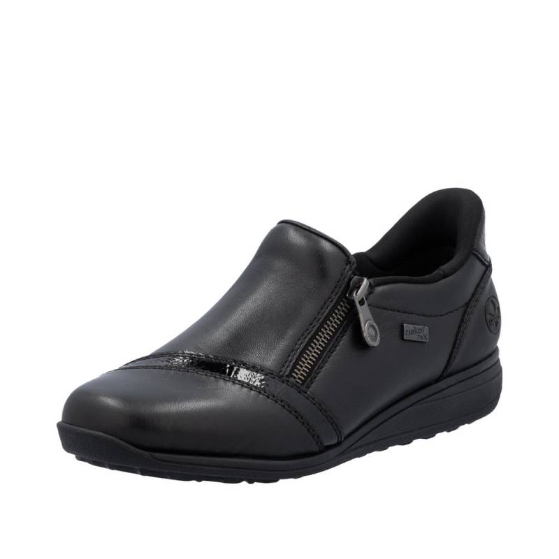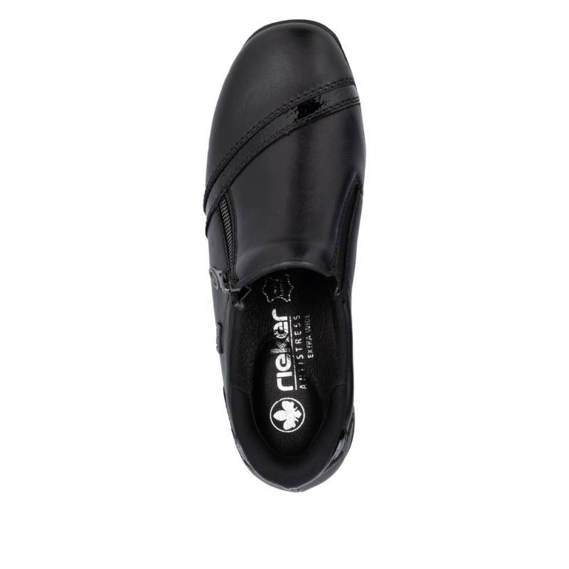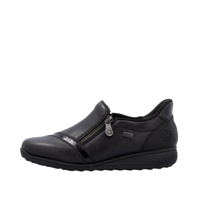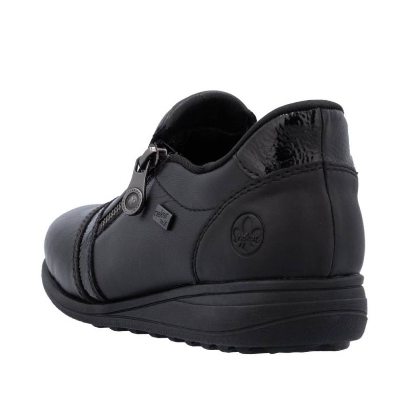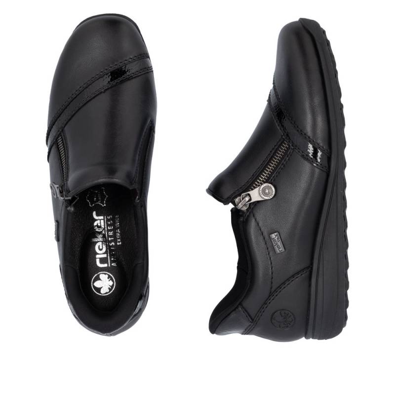 Vízállő fekete női félcipő waffle talpal (jól tapad, csúszásgátlós) keskeny lábakra. Zipzárral lehet használni, egy fényes díszcsík van az orrán. Puha bőr talpbetét található benne, a cipő talpa pedig jól hajlik és ütéscsillapított.