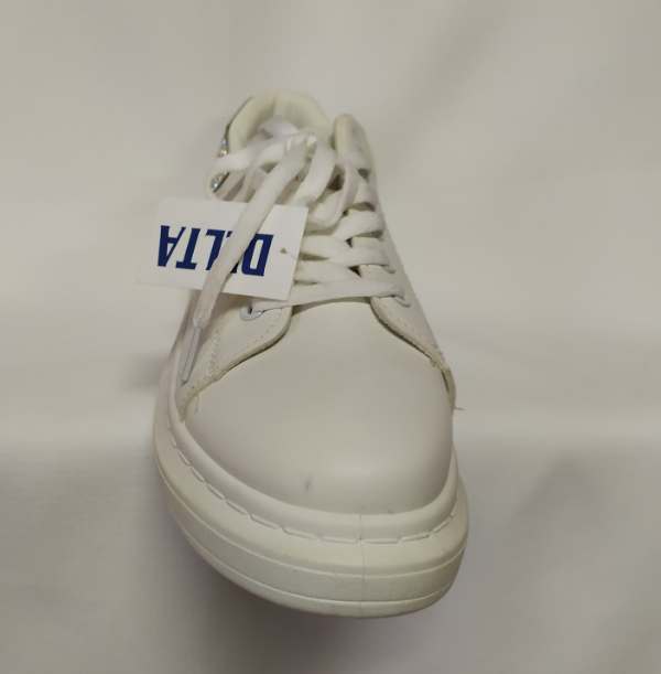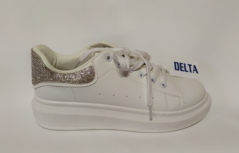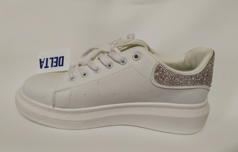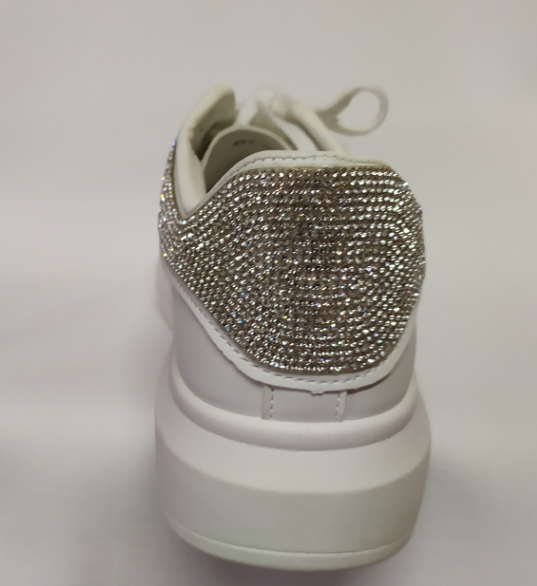 Női sportcipő csillámos berakással a gallérján, fehér színben. Talpbetétje kivehető/cserélhető. Cipőfűzővel állítható. Talpa vastag, kicsit magasított.