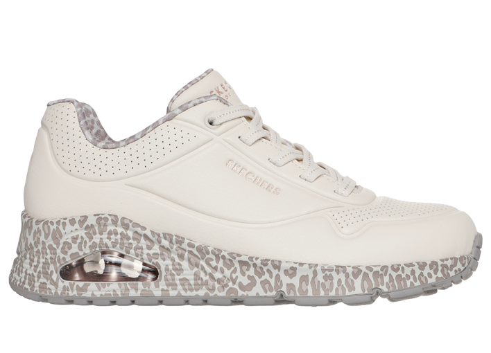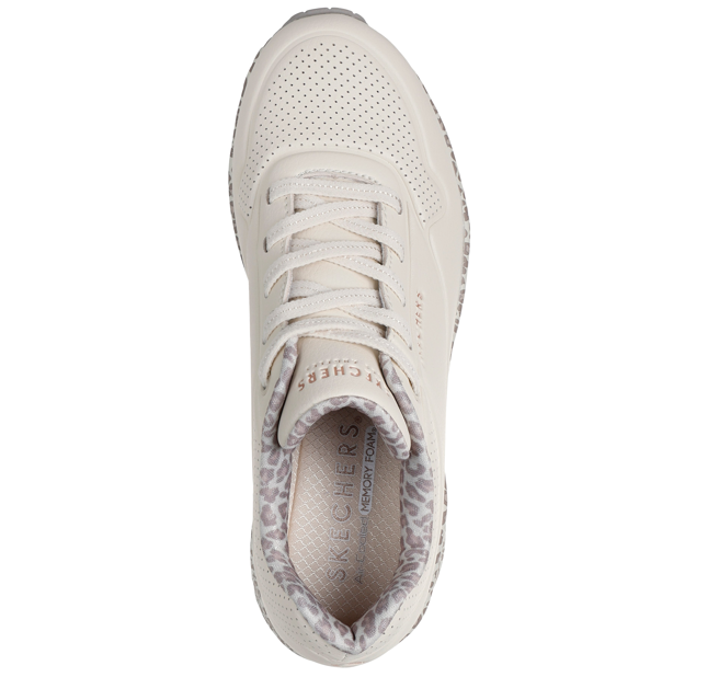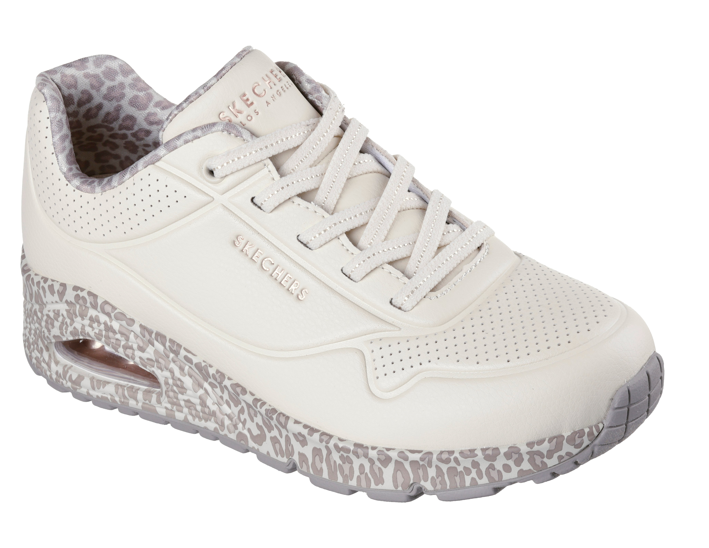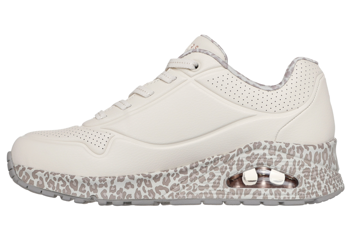 Vagány és sportos Leopárd mintás fehér Skechers szabadidőcipő, légtalppal, hogy hosszú használat után is kényelmes legyen. Belül jól szellőző memóriahabos talpbetét található, így kevésbé izzad meg benne a láb.