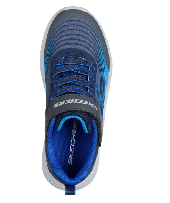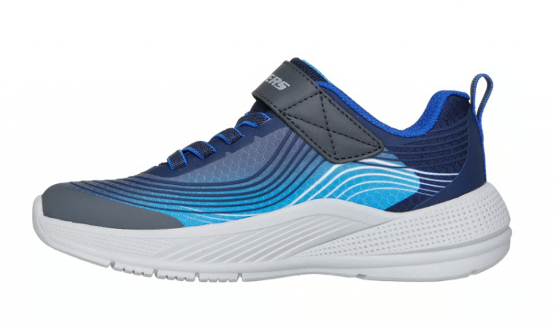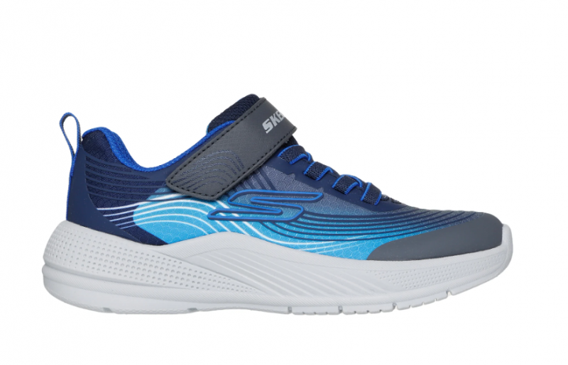 Sötétkék színű, tépőzáras fiú Skechers sportcipő, jól szellőző kialakítással. Mosógépben 30°C-on mosható, szárítógépbe nem szabad tenni. Puha, könnyű és jól hajlik a talpa.