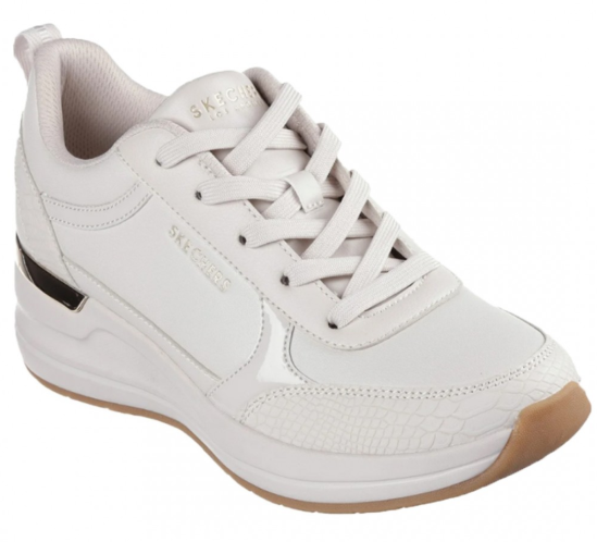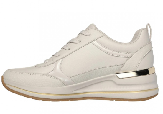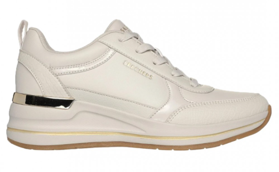 Kicsit masszívabb kialakítású fehér sport/szabadidőcipő nőknek, a Skechers-től. Aranyozott, fehér/krémes színű. Talpa puha, memóriahabos, sarka kissé emelt.