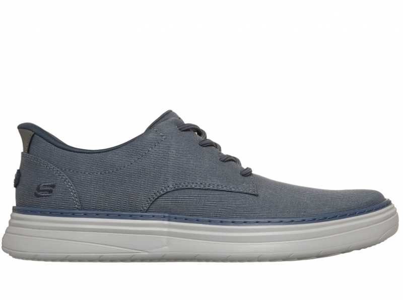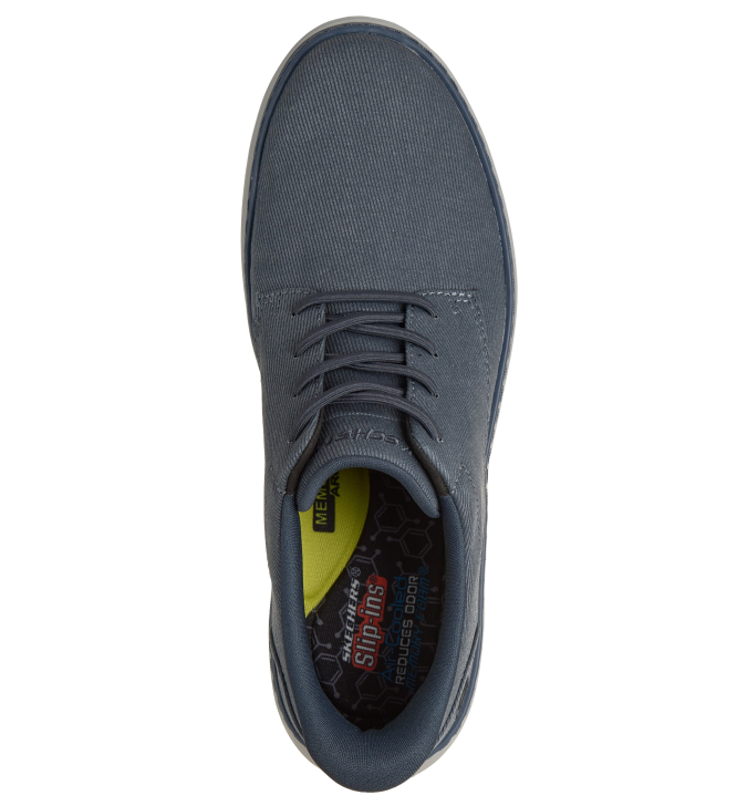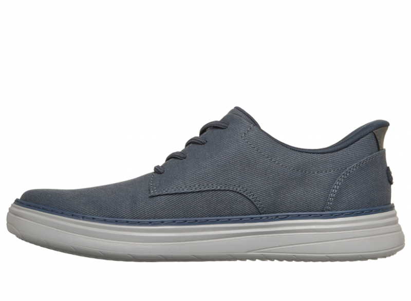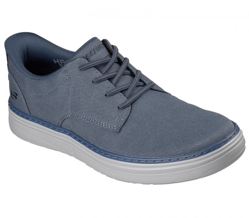Hands Freee Slip-in férfi Skechers cipő, kék színben, klasszikus stílusban. Gumis álfűzővel rendelkezik, de szükség esetén nem nehéz átfűzni egy rendes cipőfűzővel. Memóriahabos talpbetétjében szén is található, ami segít csökkenteni a szagot ha bebüdösödik.