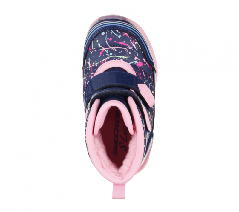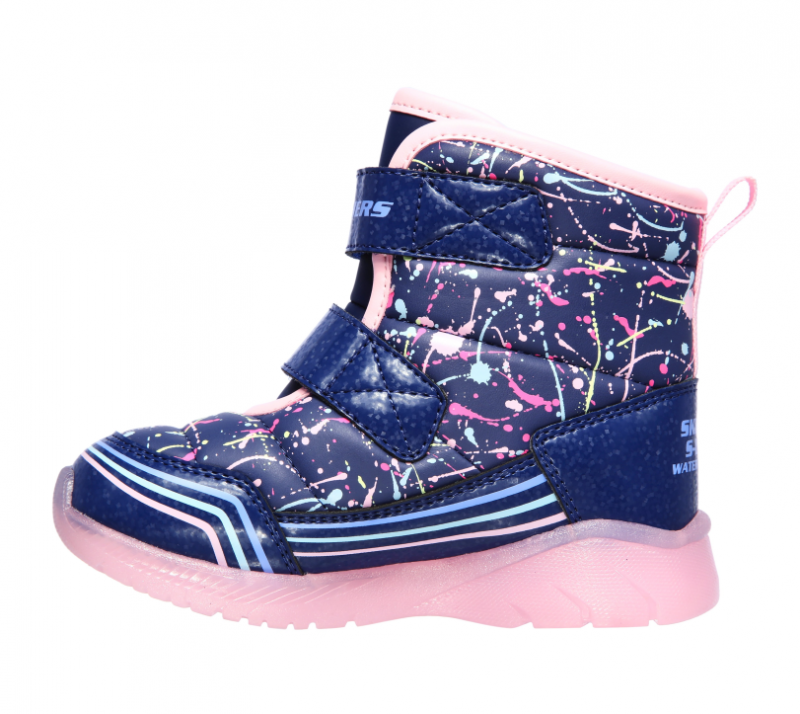 Vízlepergetős anyagból készült ez a Skechers lány hótaposó, így kiváló választás a téli időszakban. Belül bélelt, tehát melegen tartja a lábat. A talpa minden lépésnél világít. Sötét, absztrakt festékfolt mintás a csizma.