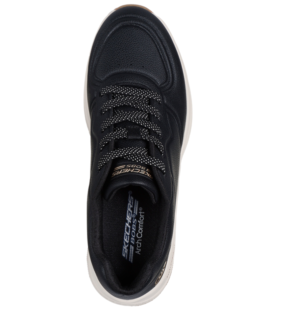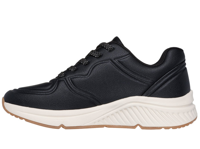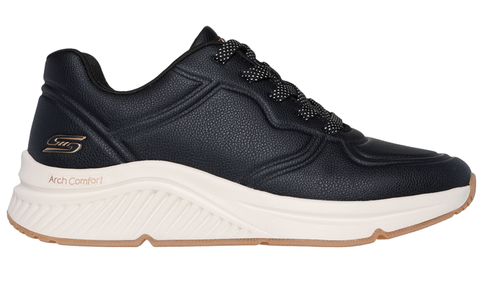 Ennek a cipőnek bizonyos részeken emelt a talpa, a komfortos használat érdekében. Fekete színű, fehér a talpa, memóriahabos talpbetéttel rendelkezik.