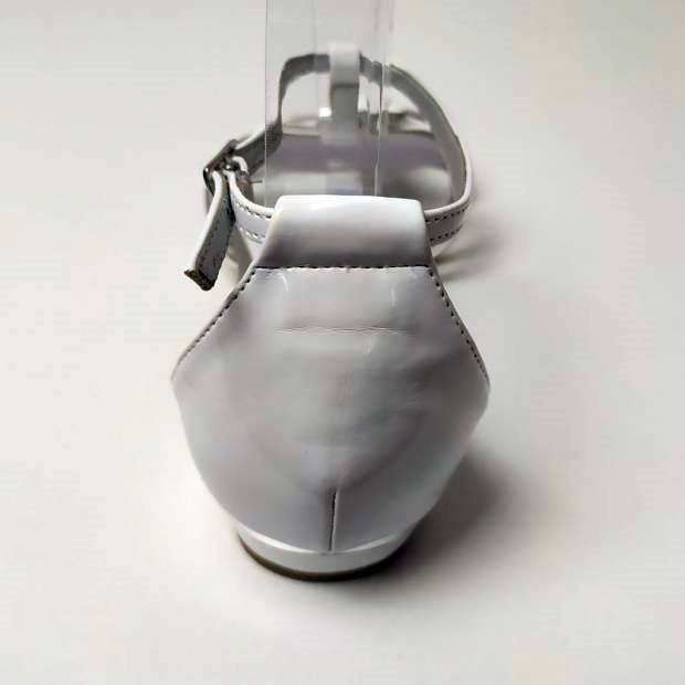 Fehér, fényes női bőr szandál alacsony sarokkal.