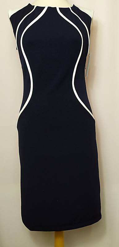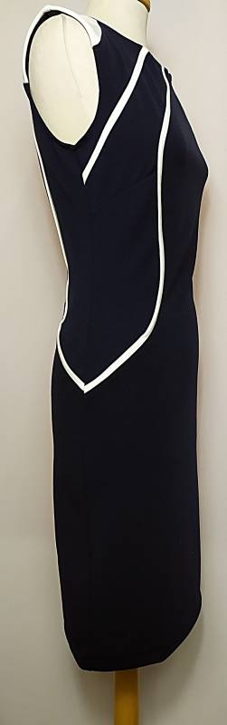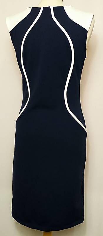 Női, alkalmi ruha, kék színben, rávarrt fehér mintával amely karcsúsítja az alakot, bal oldalán rejtett cipzár található ennek köszönhetően könnyen fel és levehető, minimálisan rugalmas anyagú. Kiváló választás bármilyen alkalomra.
